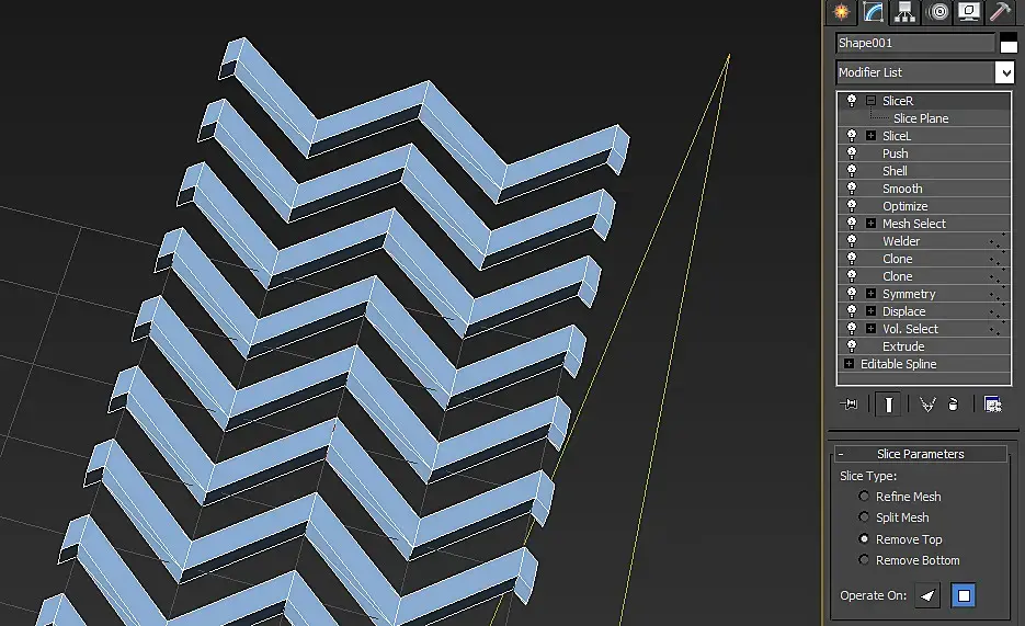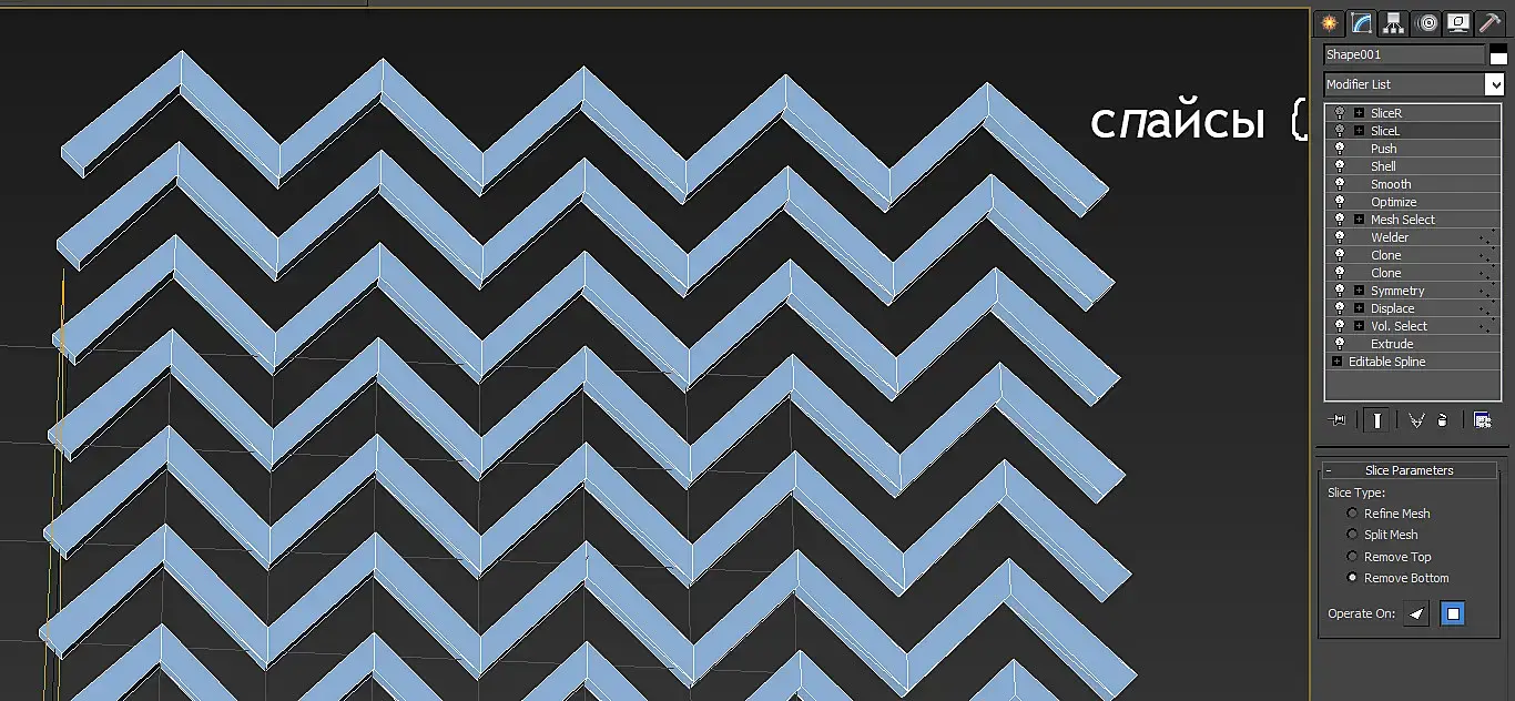 Блин, да это же.... решетка! Ёк-макарёк! Вот только края мне не нравятся, надо бы подрезать, Slice модификатор нам отлично подойдет, слева мы легко подрежем, выставив отсекающую плоскость в координаты 0.0.0, а вот правый слайс мне что- то так лень двигать, сделаю ка я привязку, связывать параметры то мы научились. Кстати если вы потеряли ваши окна Wire Dialog то все связи объектов, прям ваще все, можно найти в окне schematc view