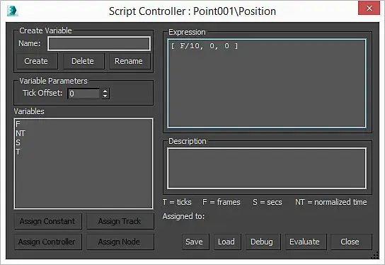 Благо никаких переменных нам создавать не нужно, тут любезно и бесплатно предоставлена переменная F - счетчик кадров. Если мы вставим в поле Expression [F/10, 0, 0], то поинт поползёт по оси Х со скоростью 0.1 единиц за один кадр, а два нуля по осям Y и Z не дадут шелохнуться поинту куда его не просят.