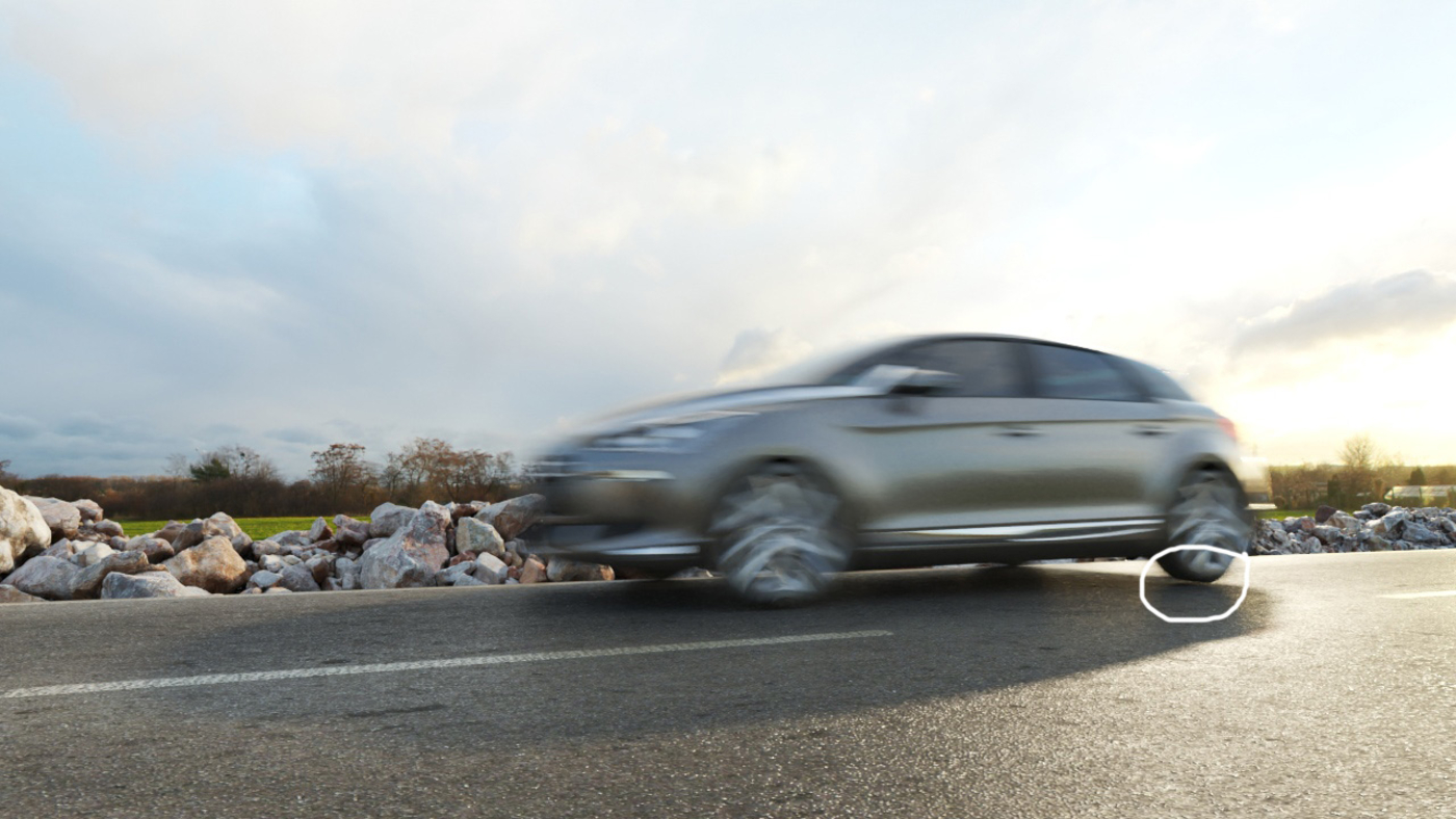 Получаем старые проблемы в виде статичной тени, размытого контура с фоном. Плюс появляется новая, т.к. вектор скорости содержит только мгновенную информацию о скорости пикселя в конкретном кадре и не более того, то и фильтр размытия сделает только линейное движение, это хорошо сработает на кузове, но не на колесах и не на объектах со сложной траекторией движения. Для удобства я заменю колеса на болванки с чекером.