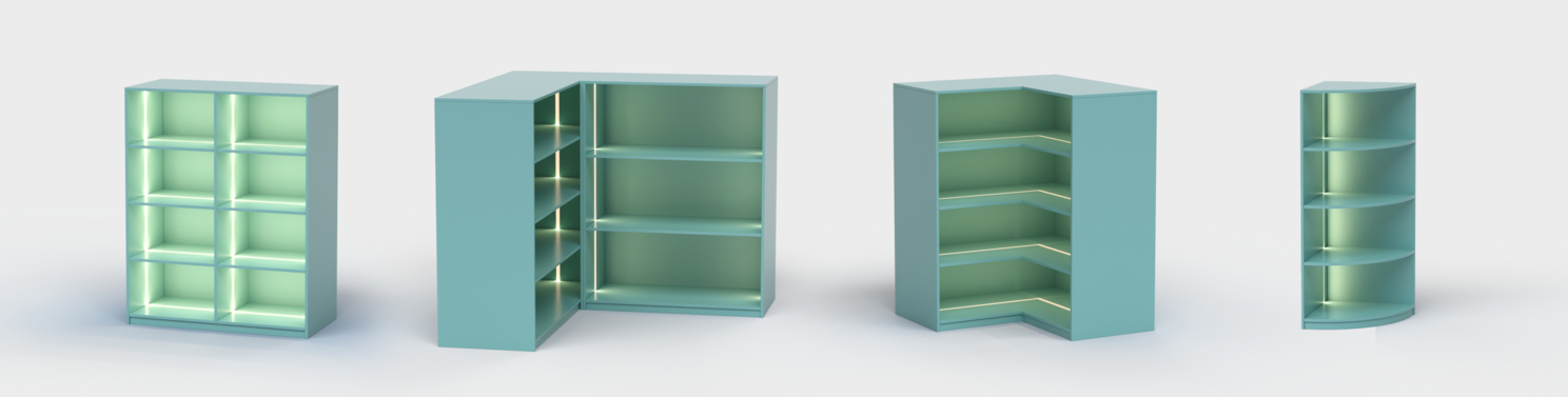 Первое, что хочется упомянуть, это возможность создания угловых и торцевых модулей, со всеми необходимыми элементами (дверьми, полками).