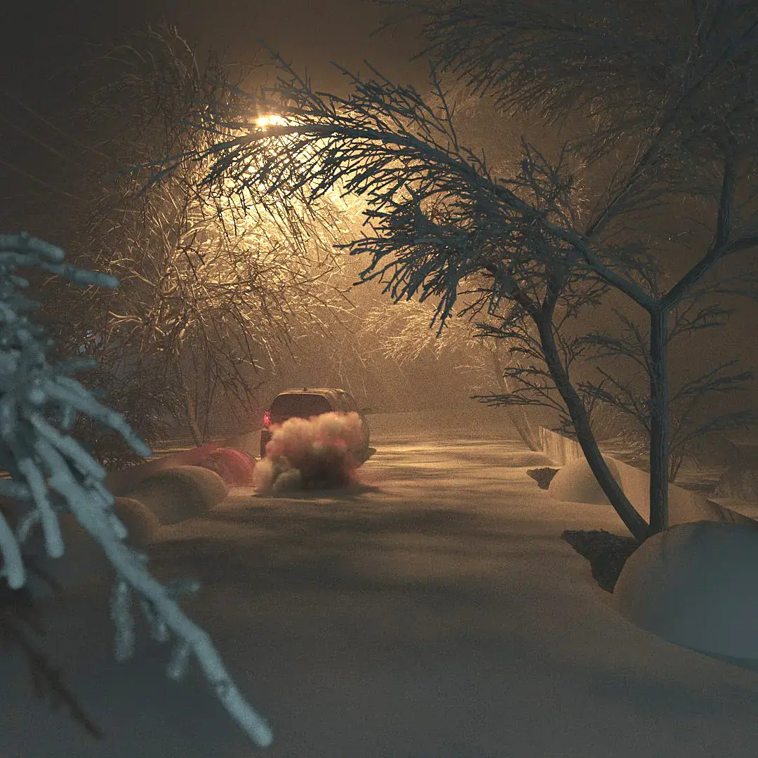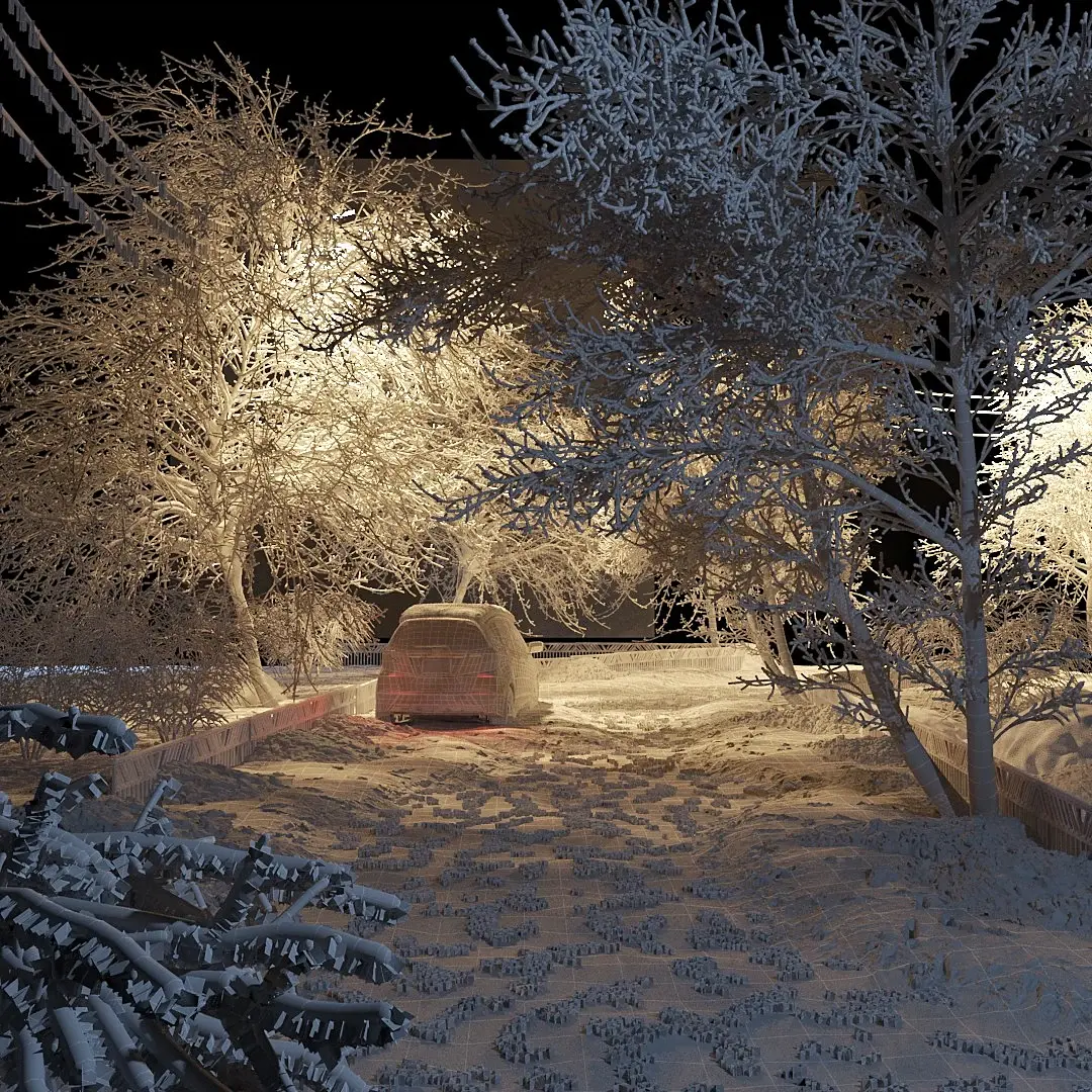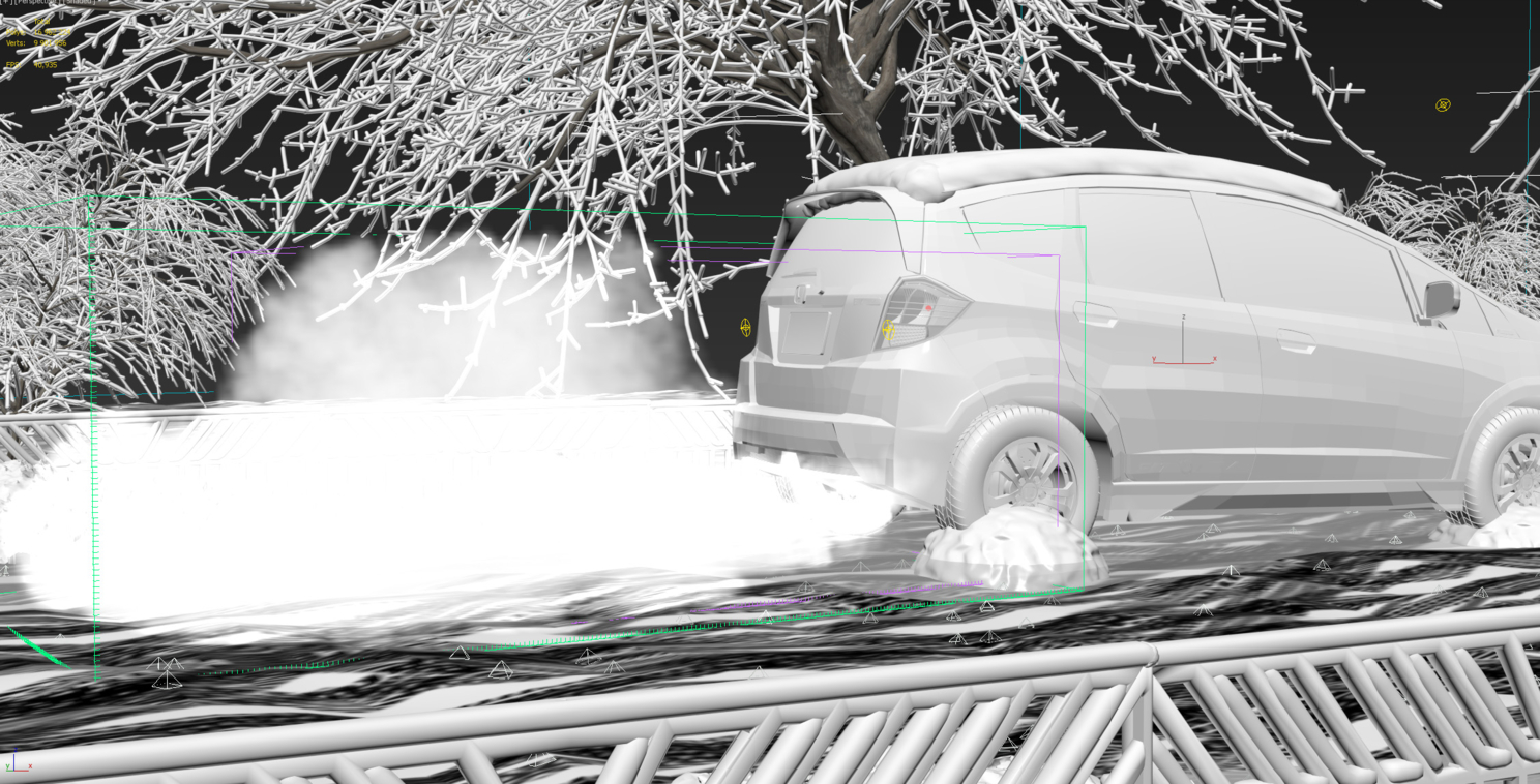 Заметили? Машина еще недоделана, а выхлоп из трубы уже на месте. Получился он очень быстро опять же из-за пресетов. Я использовал PhoeniX FD 3 и пресет Large scale smoke, опять же с некоторым небольшими модификациями. Просимулировал 350 кадров, это заняло около 15 минут, и зафризил трехсотый кадр как наиболее приглянувшийся. Потом на машину кинул falloff как на дереве, создал снежную шапку выдавливанием крыши shell'ом и набросал снега на колеса. Заранее учитывался ракурс его крупность и то, что дым перекроет половину машины, соответственно детализировать ничего не пришлось. Там вообще на всех поверхностях один материал!