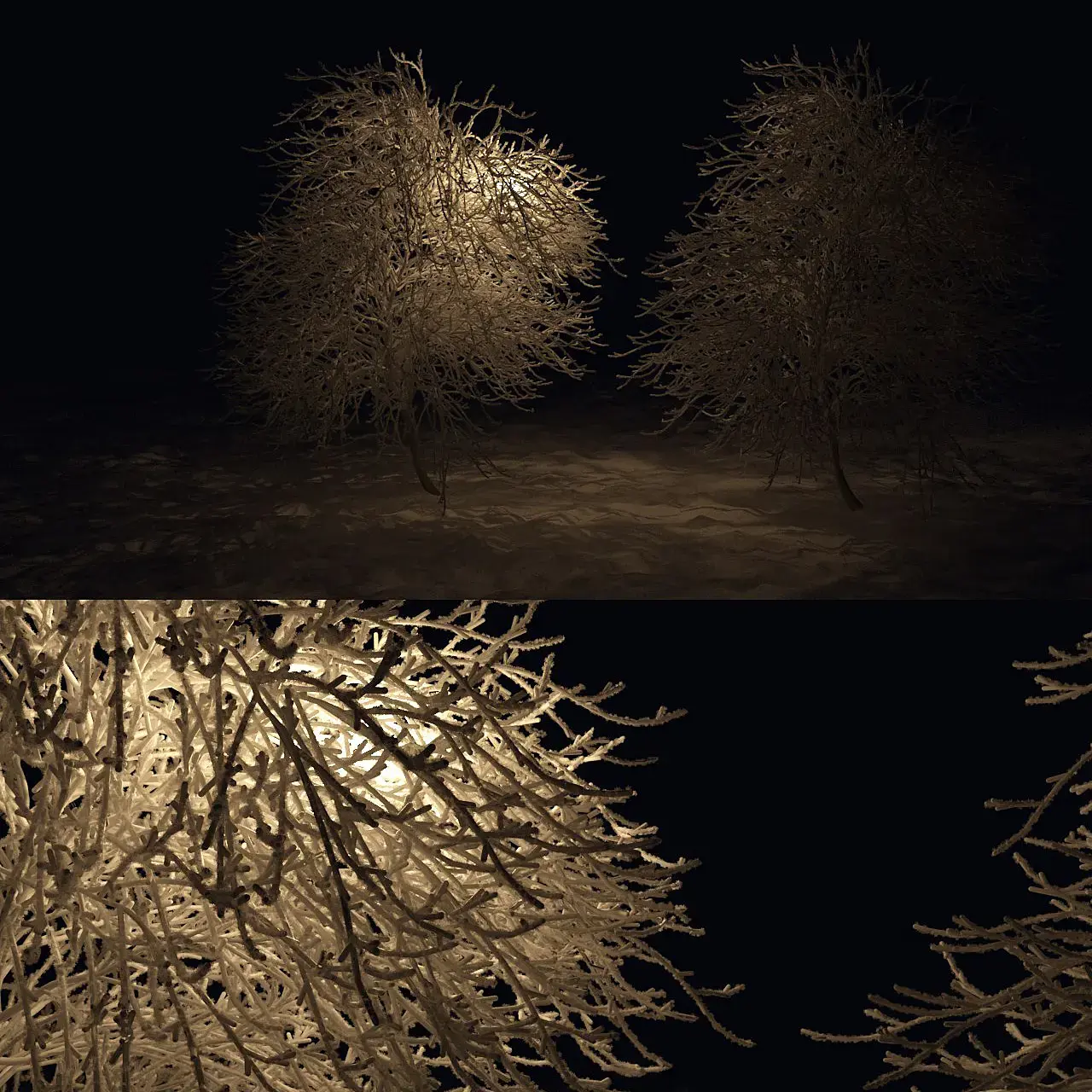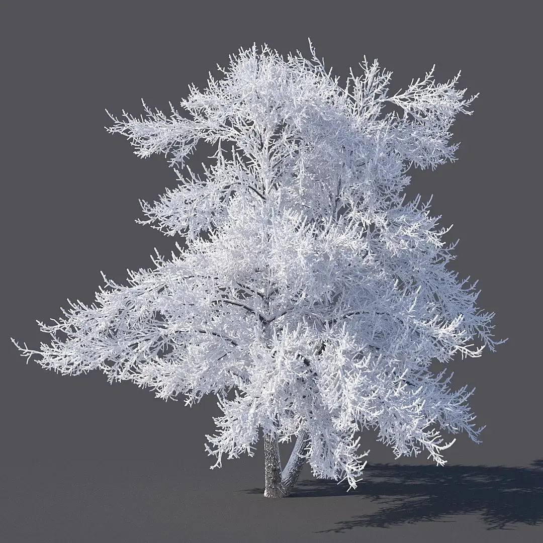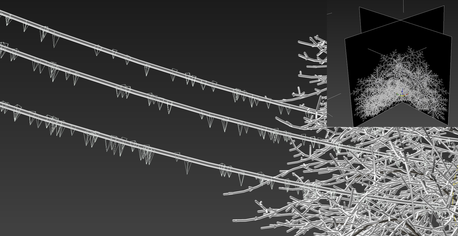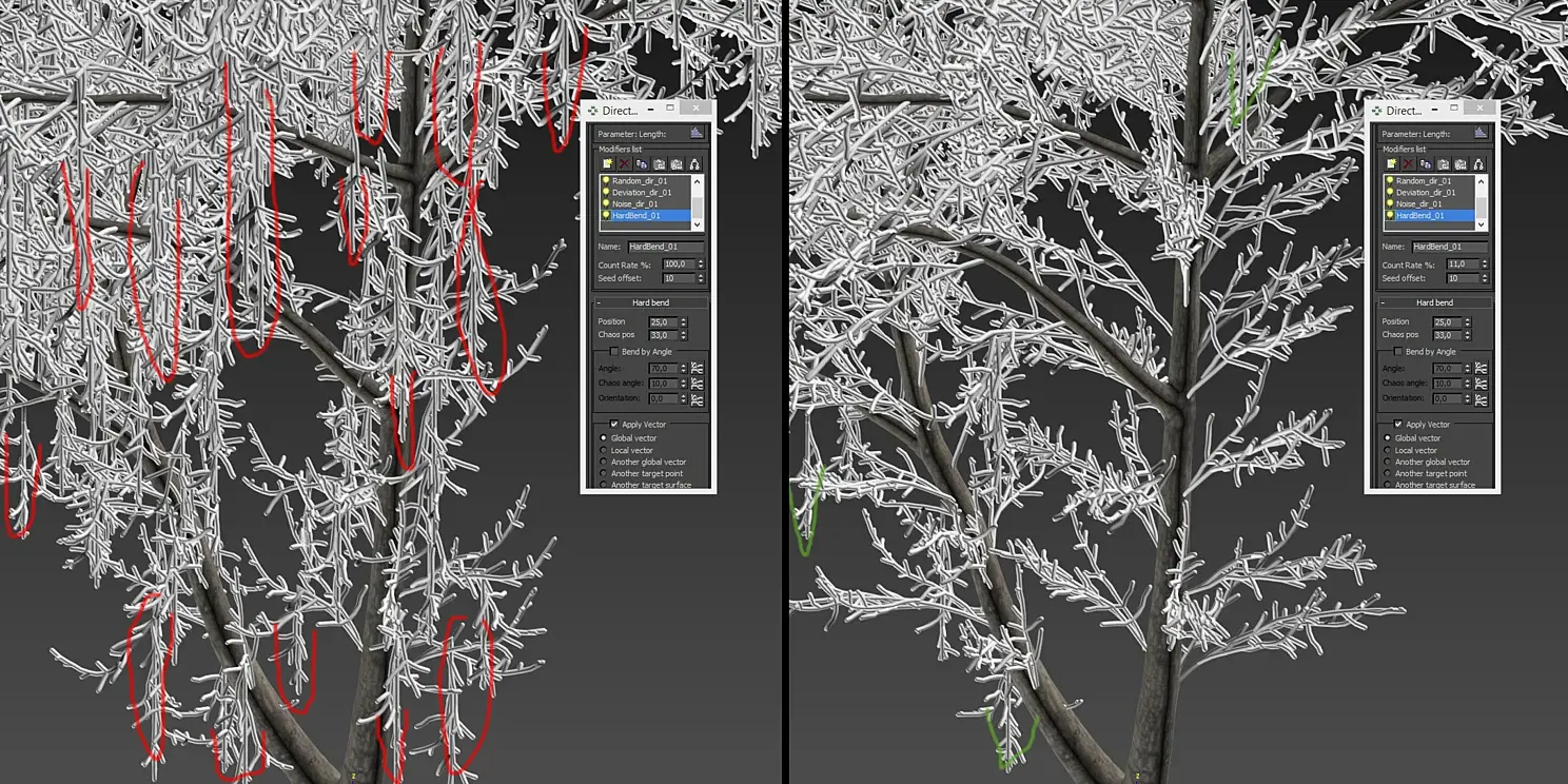 Самым интересным мне было сделать деревья, с них и начал эксперименты, использовал плагин GrowFX- мощнейший инструмент с не самым удобным и негибким интерфейсом. Эксперименты заняли пару часов, добиться нужного прогиба веток и общей формы оказалось не таким скорым делом. А еще добавить сломанных веток, раздвоение ствола, добавить пушистость инею. Кстати от неё я быстро отказался, т.к. на общем кадре вклад в картинку был незначительным, но систему нагибает даже одно такое дерево, а у меня их с десяток штук + кусты.