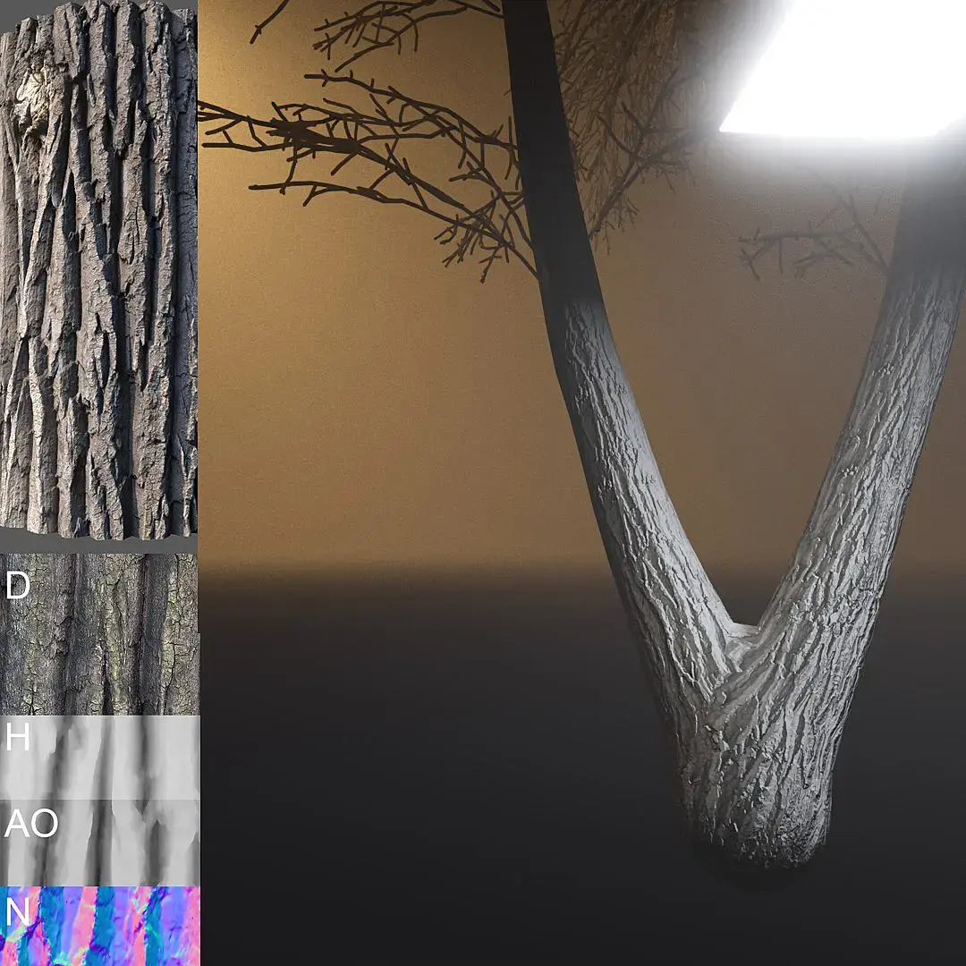 Кору я достал из своих старых отсканированных материалов (лежит тут на 3ddd) , она универсально подходит к большинству стволов лиственных пород. Сымитировать снег решил просто картой Falloff по Z оси мира- это снег сверху, и по оси X немного - это снег, прилипший сбоку от ветра. Displacement map не стал использовать по той же причине, что и пушистый иней.