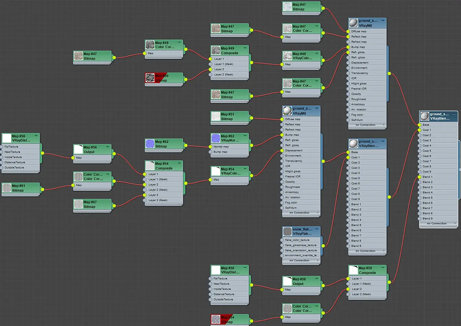 Получился замудрённый бленд материал. Замудрённый в основном из-за многослойного дисплейсмента и комбинацией всего этого текстурного фарша в разных режимах наложения и разных UVW каналах с VrayDistanceTex.
