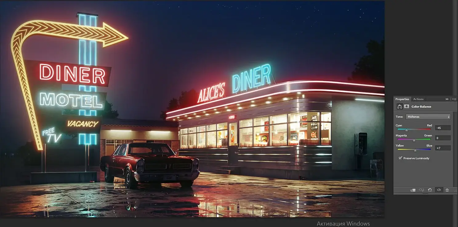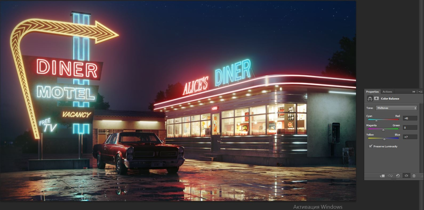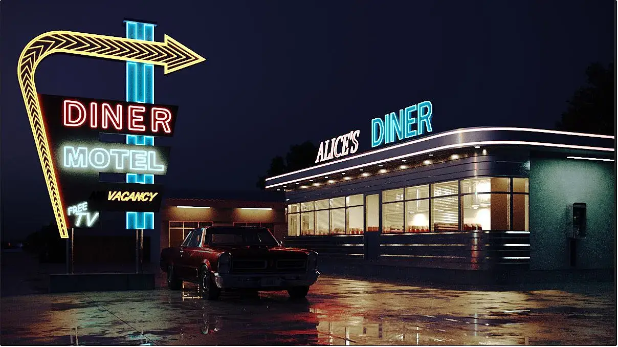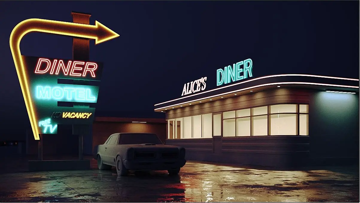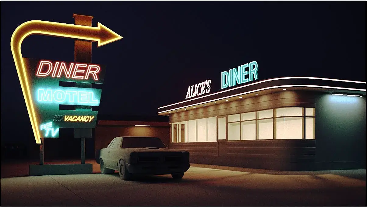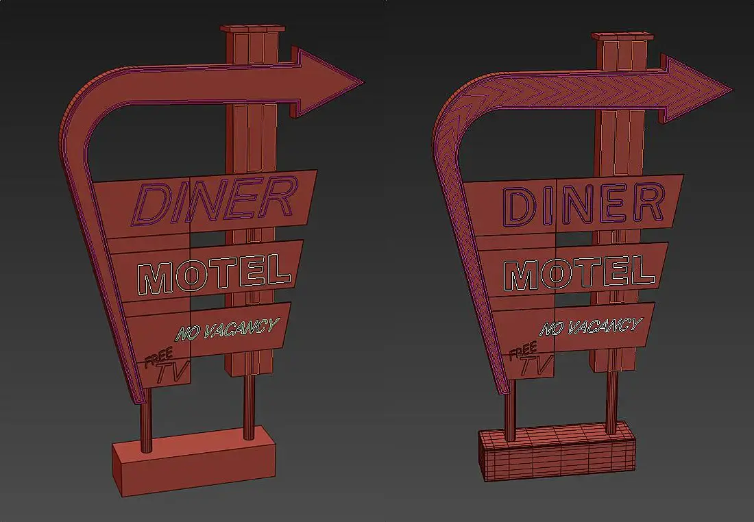В работах, целью которых не является демонстрация навыков моделирования, если есть возможность, часто использую готовые модели, но в большинстве случаев переделываю шейдера или создаю их с нуля. В данной сцене я использовал готовую модель автомобиля Pontiac GTO 1965 от польского художника Pawel Kotwica, которую он выложил в свободный доступ, за что ему отдельная благодарность. Модель таксофона и несколько элементов мебели нашел на 3ддд. Спасибо авторам моделей. Мотельный знак смоделировал на основе нескольких референсов, с помощью сплайнового и полигонального моделирования, в процессе немного дорабатывал и пару раз менял шрифт надписей.