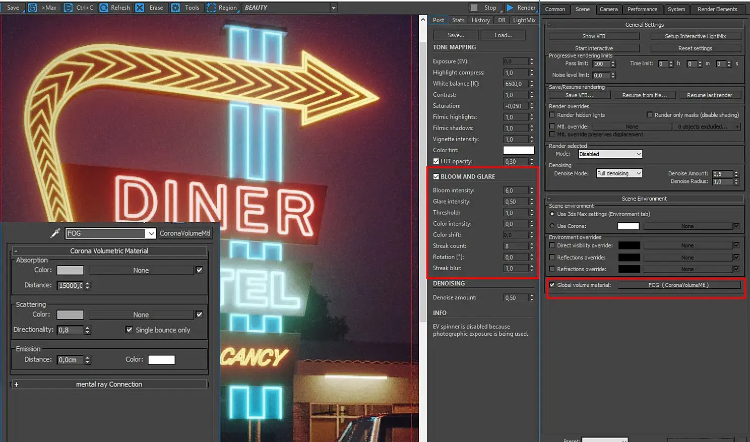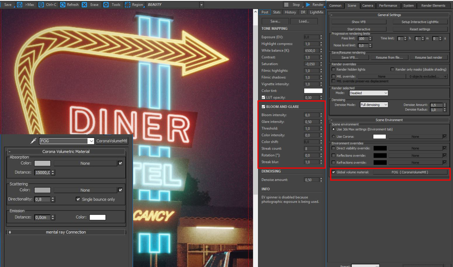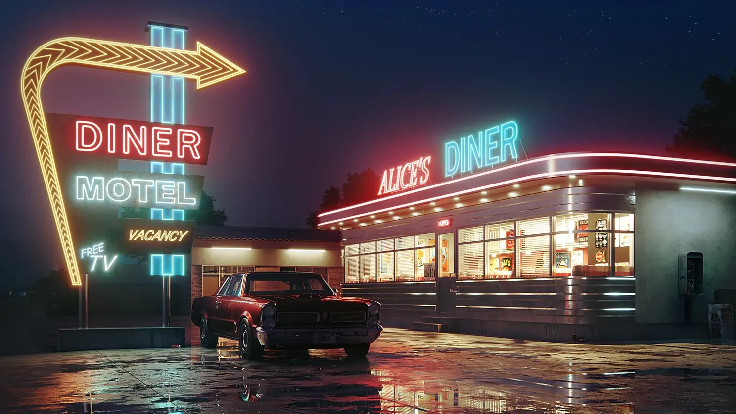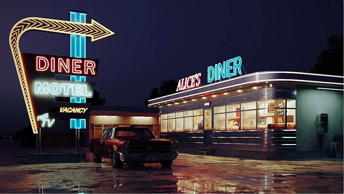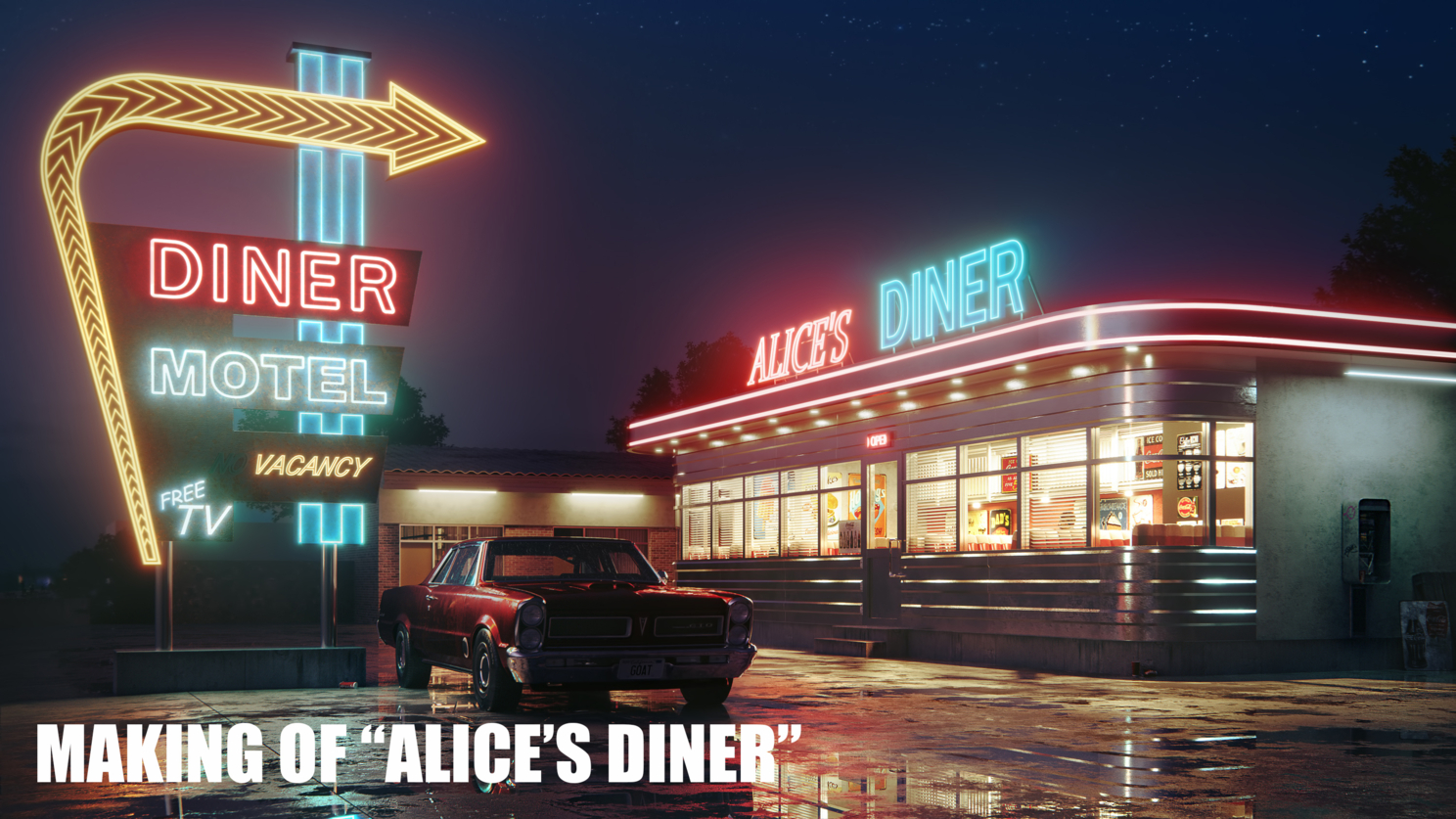 В работах, целью которых не является демонстрация навыков моделирования, если есть возможность, часто использую готовые модели, но в большинстве случаев переделываю шейдера или создаю их с нуля. В данной сцене я использовал готовую модель автомобиля Pontiac GTO 1965 от польского художника Pawel Kotwica, которую он выложил в свободный доступ, за что ему отдельная благодарность. Модель таксофона и несколько элементов мебели нашел на 3ддд. Спасибо авторам моделей. Мотельный знак смоделировал на основе нескольких референсов, с помощью сплайнового и полигонального моделирования, в процессе немного дорабатывал и пару раз менял шрифт надписей.