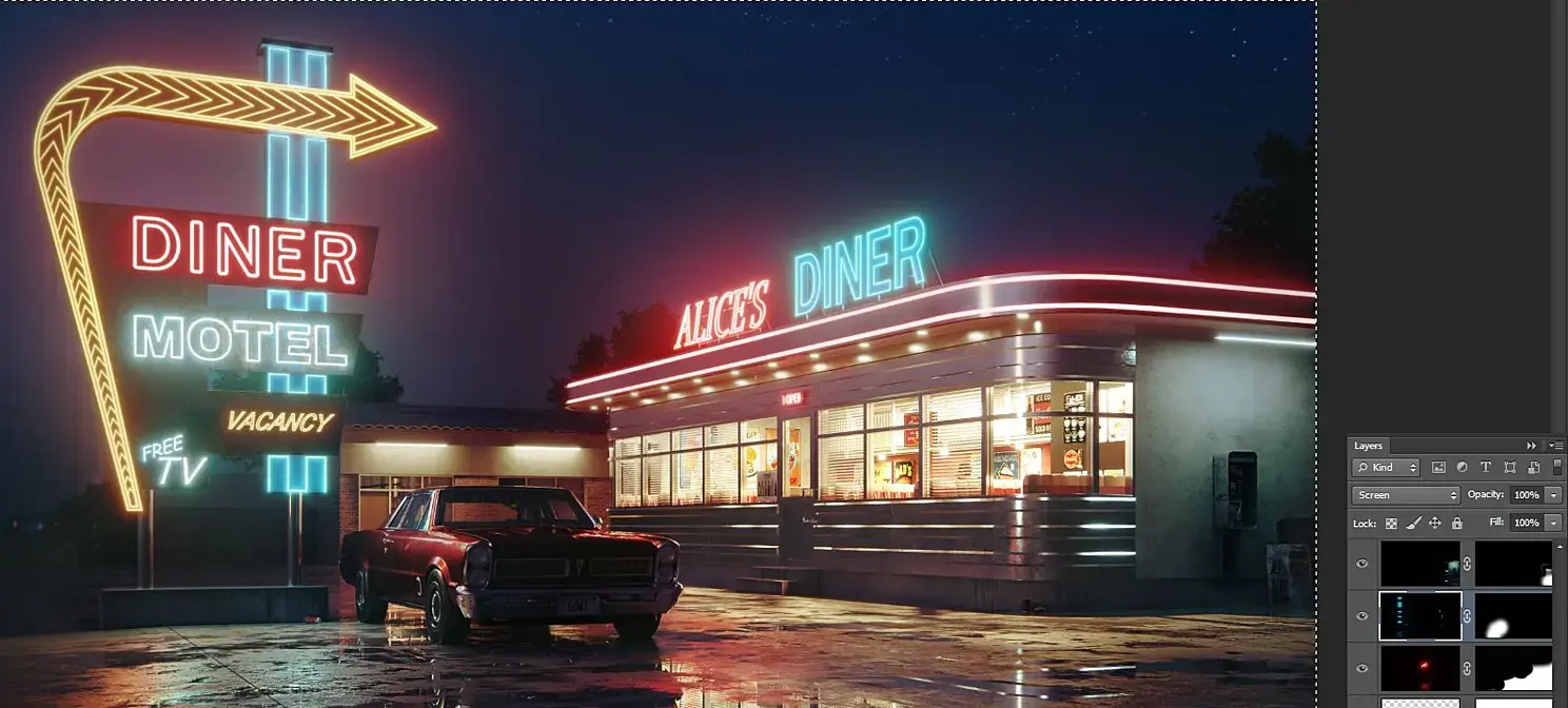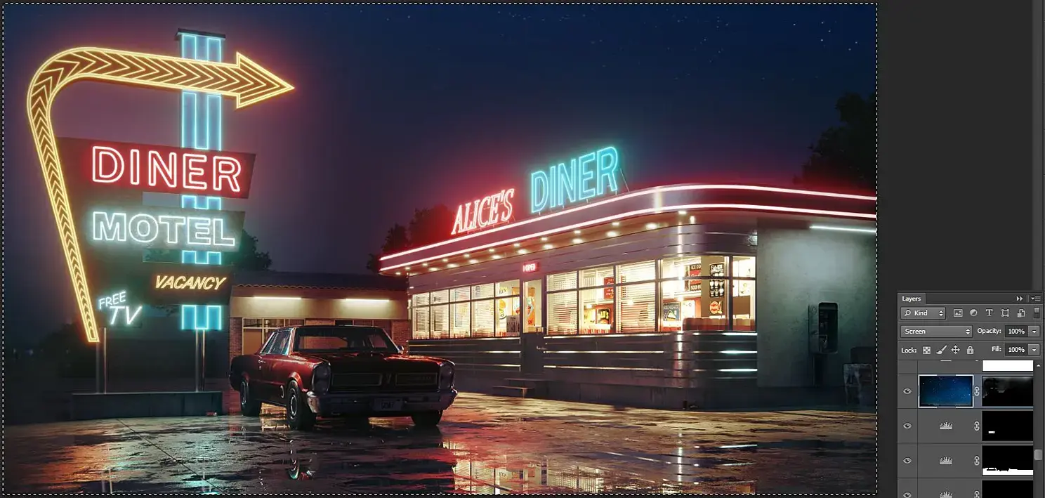 Также, усилил оттенки от световых элементов на поверхности стоянки, используя LightSelect слои в режиме наложения screen.
