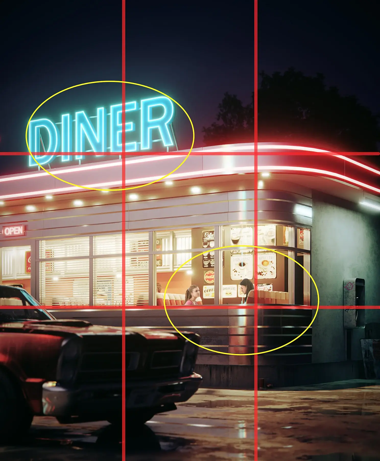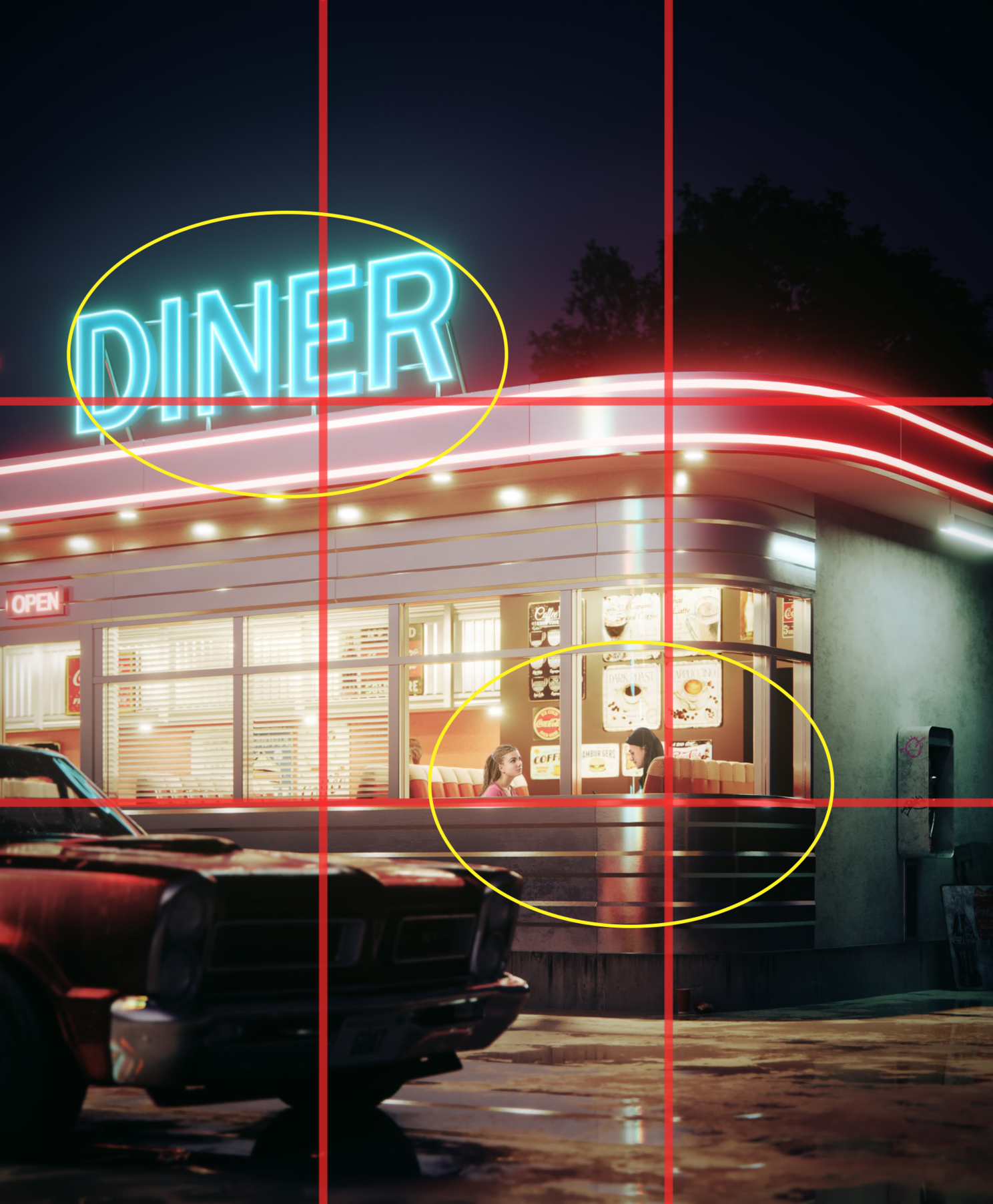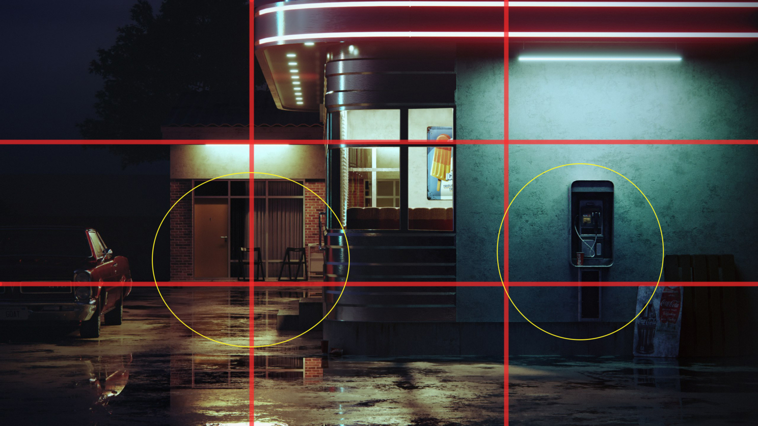 Немного о композиции кадров.Как я уже писал ранее, композицию основного ракурса скопировал с референса, но для двух других выставлял сам.При постановке я взял за ориентир правило третей, стараясь расположить основные точки композиции ближе к пересечению осей.