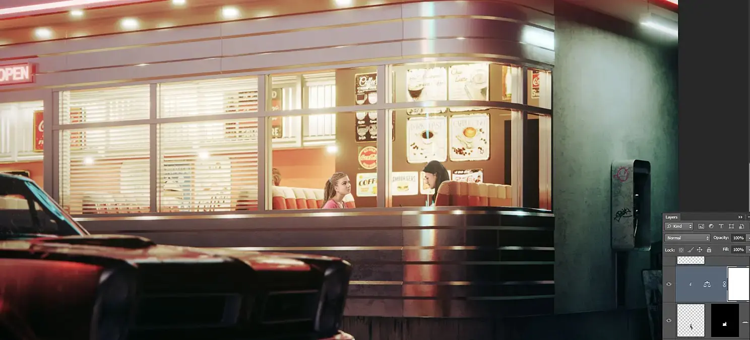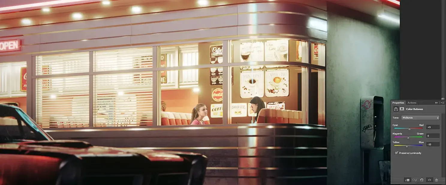 Постобработка второго изображения в основном заключалась в добавлении людей.Девушек я взял из сборника VizPeople FREE CUT OUT POPLE V1.Вставив изображения девушек по максе, применил размытие по гауссу на 0,5 пикселя, добавил шума на 1% чтобы свести изображения по шумности и применил color balance.