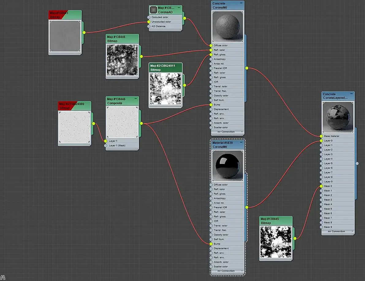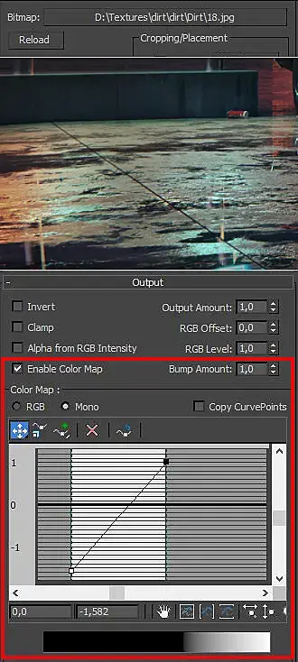 Для имитации постепенного высыхания воды вокруг луж, я использовал одну и ту же карту для глянцевости основного материала бетона и для маски луж. В маске для луж я усилил контраст через Color map в настройках карты для того, чтобы немного сжать островки луж.