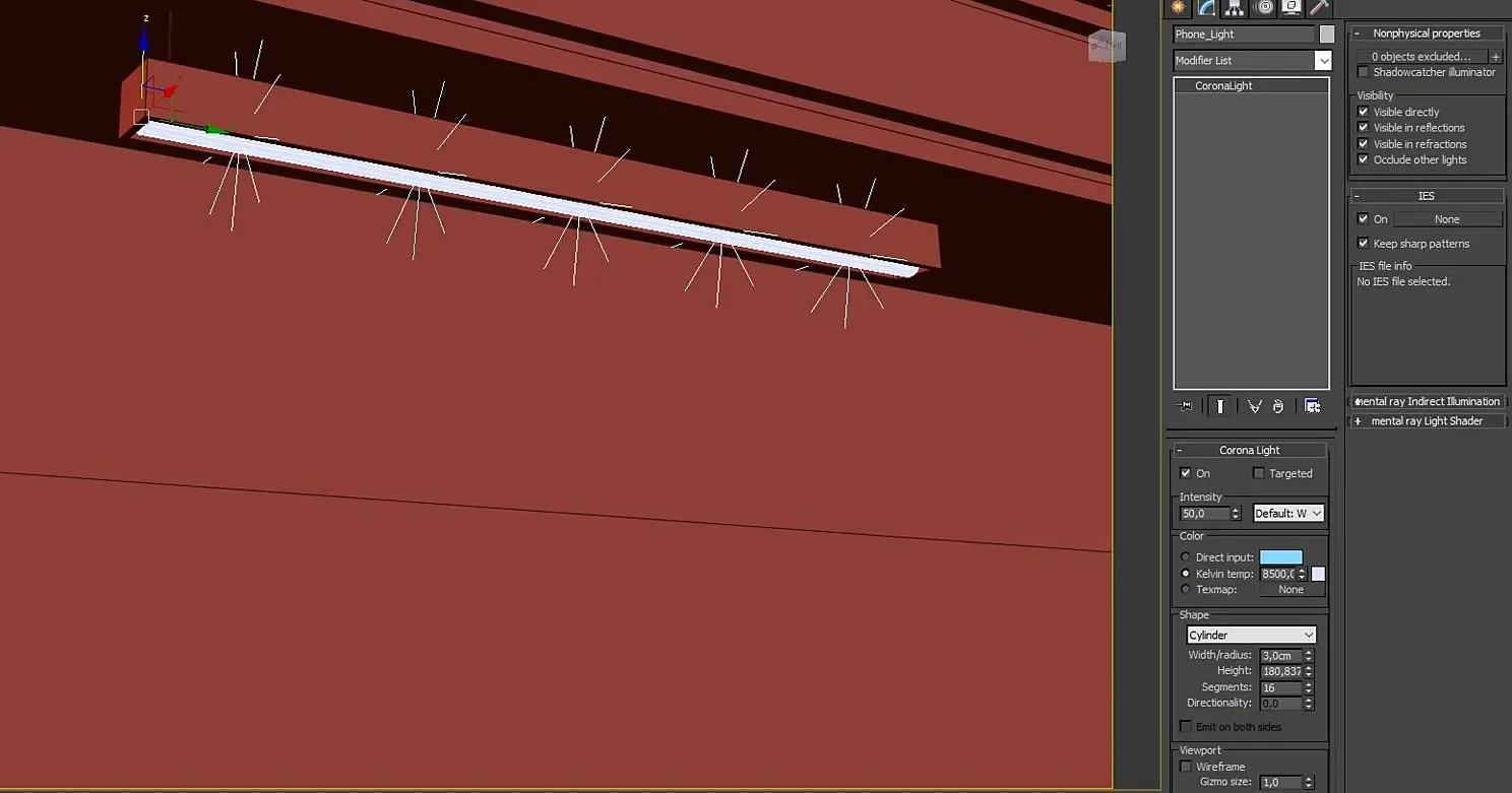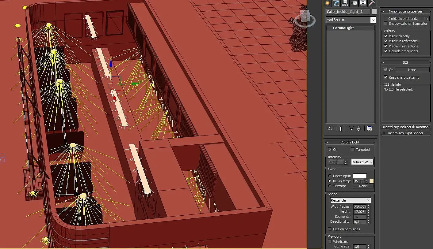 Освещение внутри закусочной состоит из CoronaLight (Disk) и CoronaLight (Rectangle) имитирующих возможное реальное расположение ламп в такого рода заведениях.