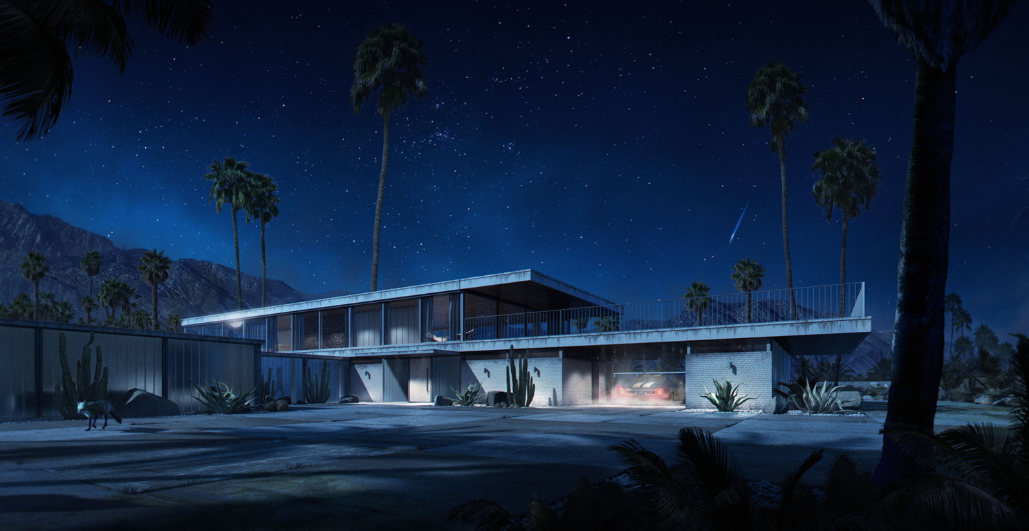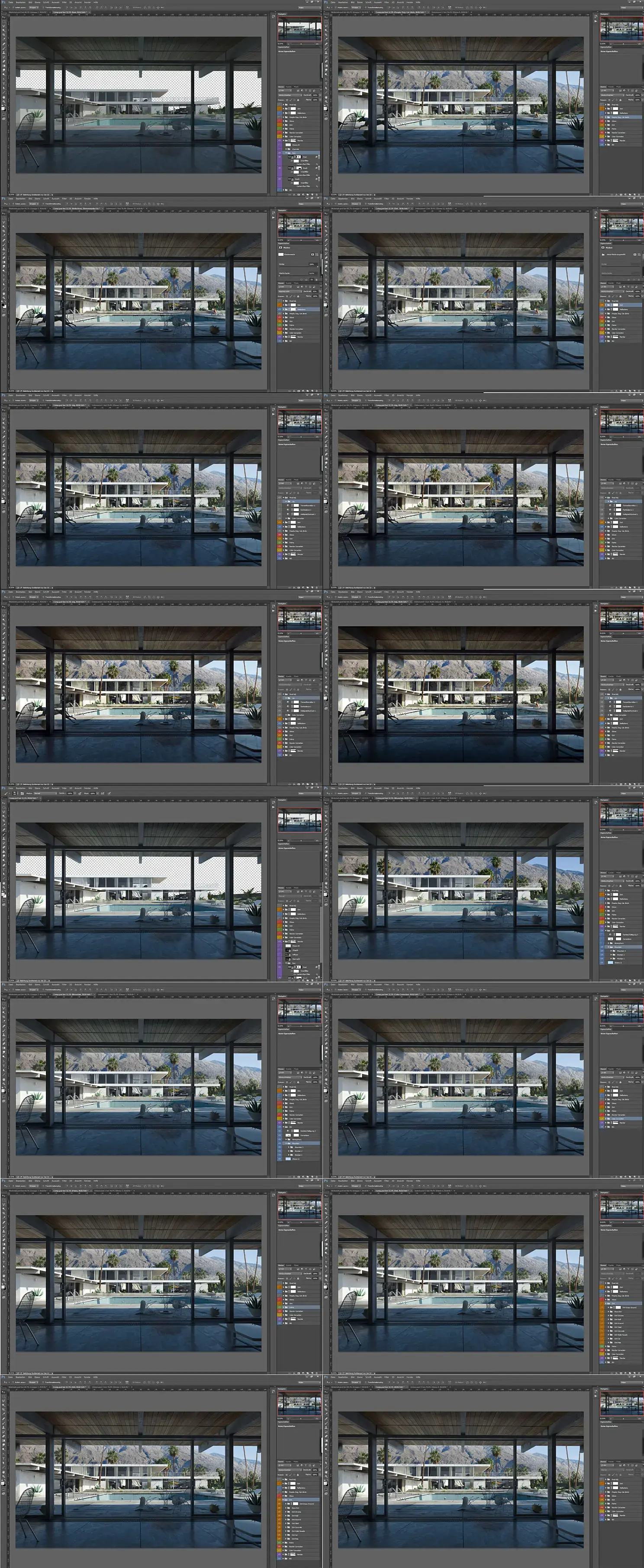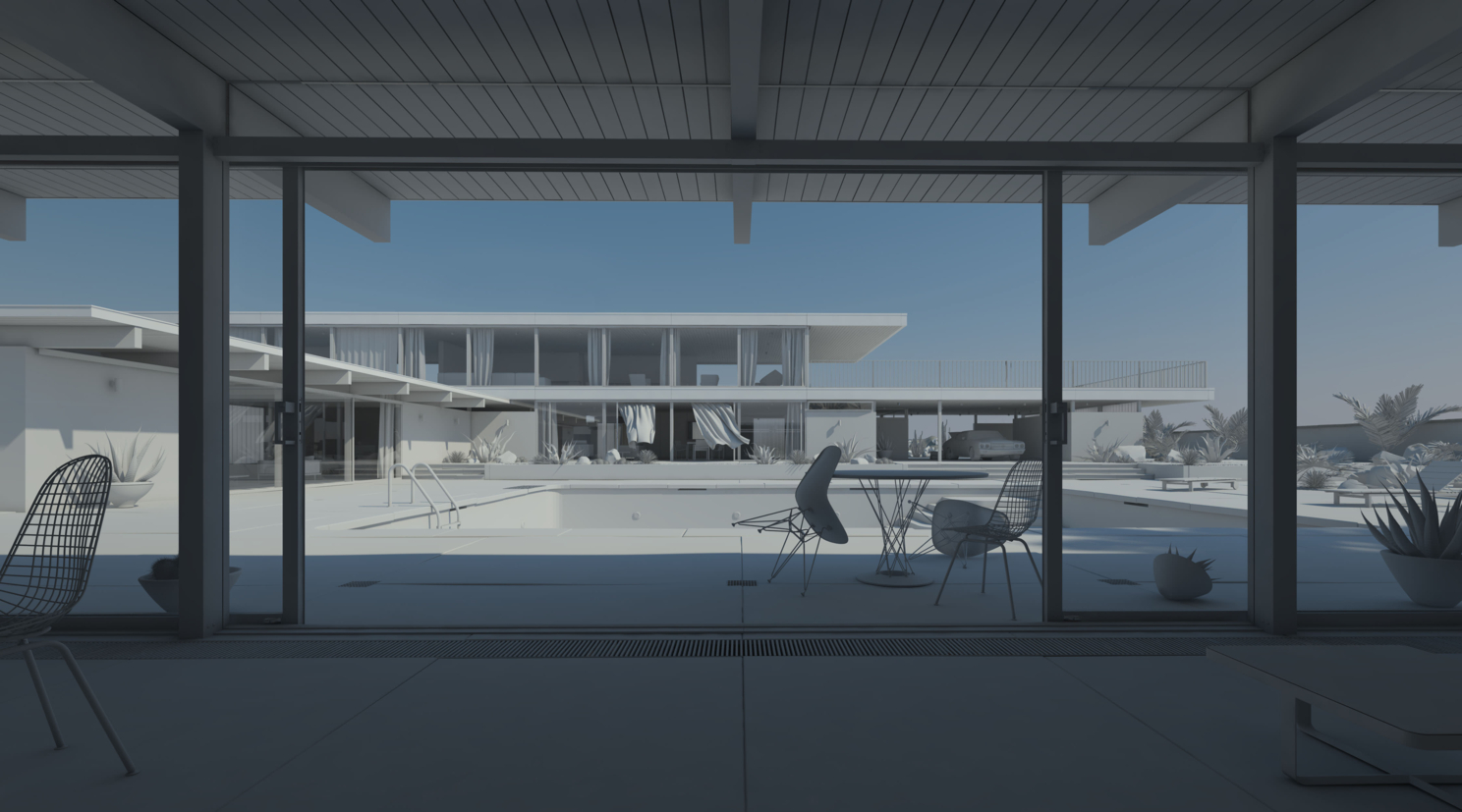 Мы решили изобразить жаркий летний день, который бы отлично соответствовал Калифорнии. С солнцем из «SketchUp» легко работать. Свет и тени точно регулируются под наши нужды, вот почему мы решили сделать работу без «V-Ray Dome Light». Настройки были близки к базисным. Для постобработки (Photoshop) мы также отрендерили следующие канали: «Diffuse Filter»; «Raw Light»; «RenderID» and «ZDepth».