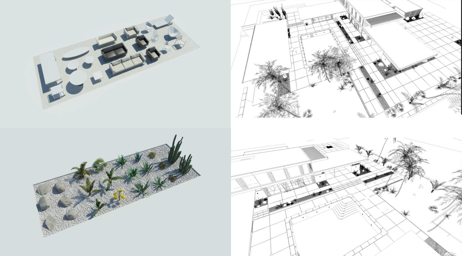 Занавески были сделаны с помощью «Marvelious Designer». Мы экспортировали «vraymesh», потому что модели были довольно тяжелыми. Другие объекты, как камни и мебель, были взяты с «3D Warehouse». Некоторые модели мебели были взяты прямиком со страниц производителя и немного откорректированы.