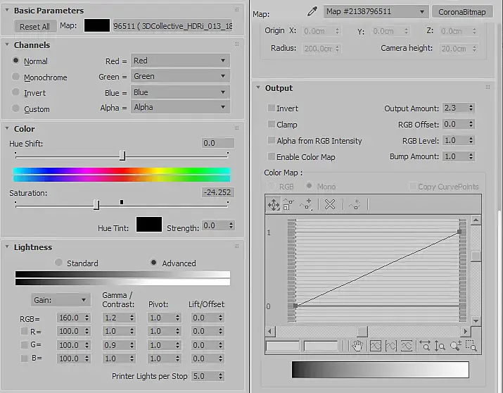 В этой главной вечерней картинке решил сконцентрировать больше внимание на костре и людях вокруг него, поэтому больше света было направленно именно на эту область. В этом ракурсе использовал HDRI карту под названием «3DCollective_HDRi_013_1854_16K.hdr» из сборника «3DCollective Real Light 22 HDRi Pro Pack» (один из моих любимых сборников). Впоследствии уже в фотошопе скорректировал цвет освещения до необходимого оттенка. Ниже настройки этой карты.