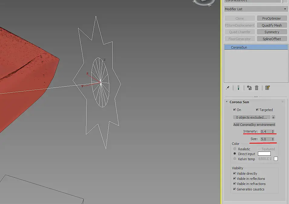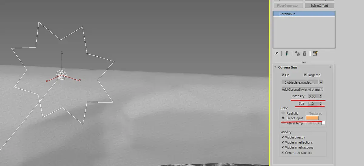 Параметры corona Sun сделал следующими: размеры солнца на 20, а интенсивность 0,02, цвет тёплый (Hex Color: F5CDAD). Так же пришлось немного сфейковать, чтобы усилить свет из окон дома, поэтому поставил для этого два плейна с настройками, как на картинке ниже.