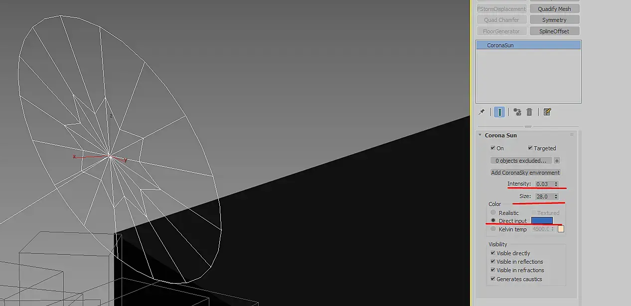 Для того чтобы усилить синий свет из окна, задал соответствующий оттенок в настройках Corona Sun, а чтобы тени были размытыми увеличил размер солнца до 20.