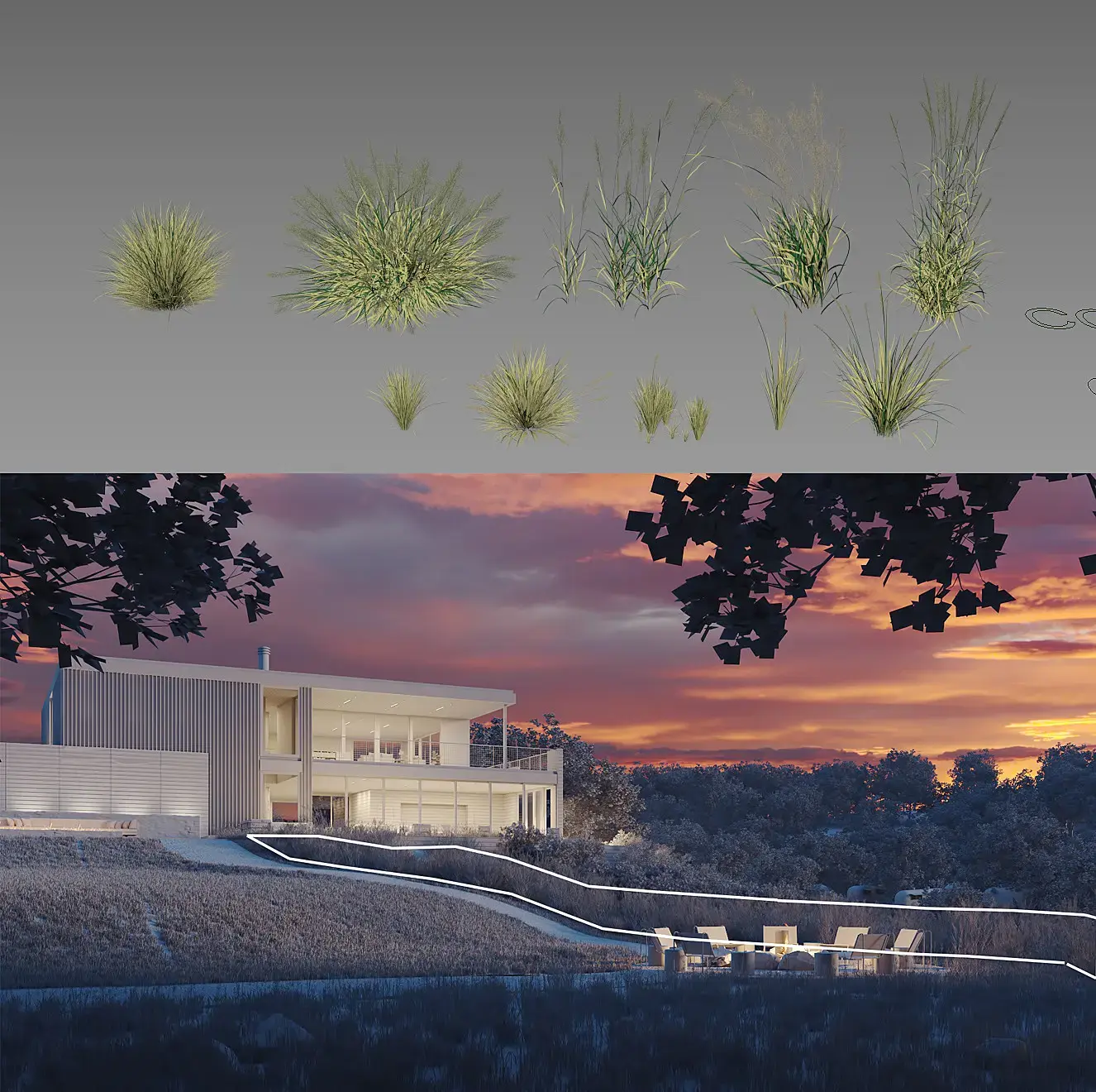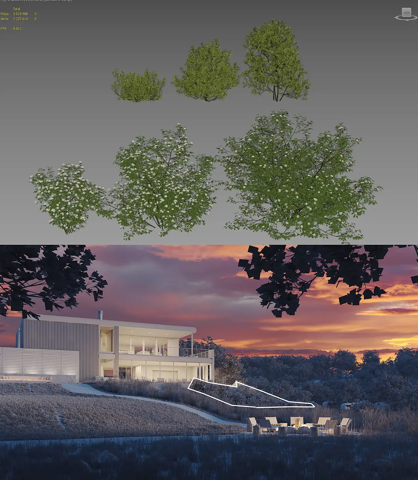 Вся растительность бралась в основном из сборников «Max Tree». Вся трава и растения рассаживались при помощи Multiscatter и местами Corona Scatter. Для экономии ресурсов компьютера использовалась опция в Multiscatter - camera adaptation, её польза в том, что скаттер подгружает объекты только в зону видимости выбранной камеры, а за пределами нет. Это очень удобно, когда работаешь с большими площадями посадки растительности. Ниже зоны посадки травы.
