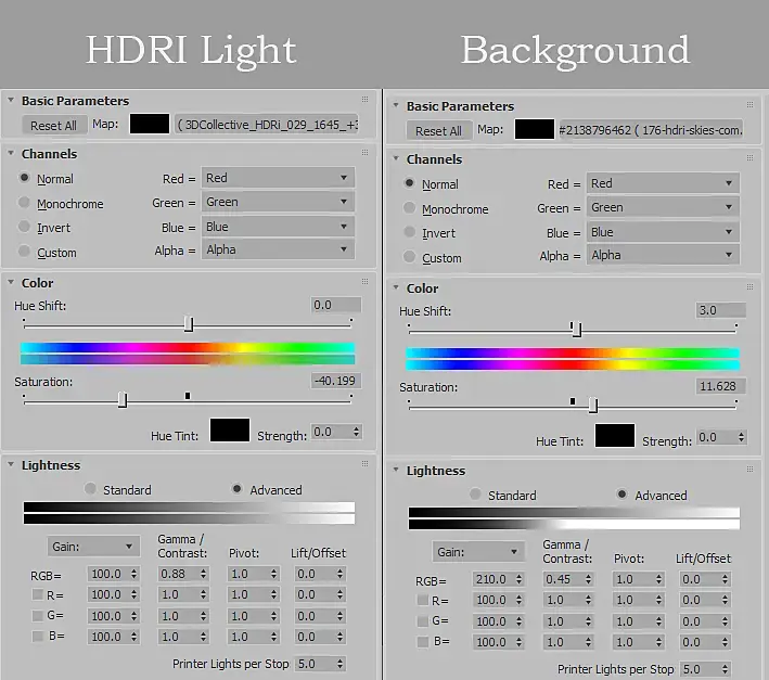 Настройки HDRI карт для фронтального и ближнего ракурса.