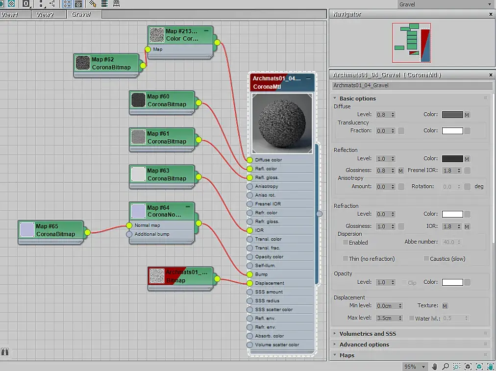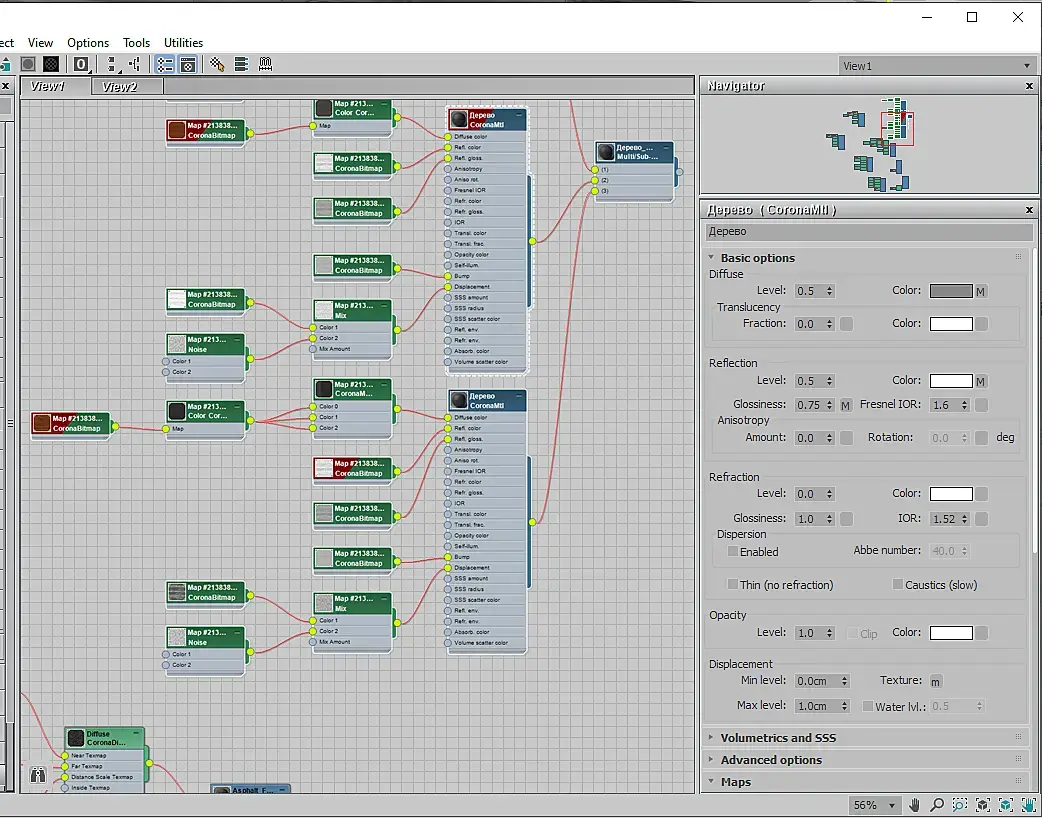 Наиболее проработанный и интересный материал у асфальтовой дороги. Создал дорогу, на которой уже проглядывается почва и у краёв она плавно переходит в материал обочины, поэтому пришлось создать многосоставной материал. Материал асфальта смешал с материалом почвы по маске дерта, затем сделал такое же смешение с почвой у обочины, но уже по маске с картой Distance и почва равномерно распределилась у краёв дороги. Таким же образом в материале асфальта использовал карту Distance, чтобы в середине дорогу сделать темнее, а у краёв светлее.