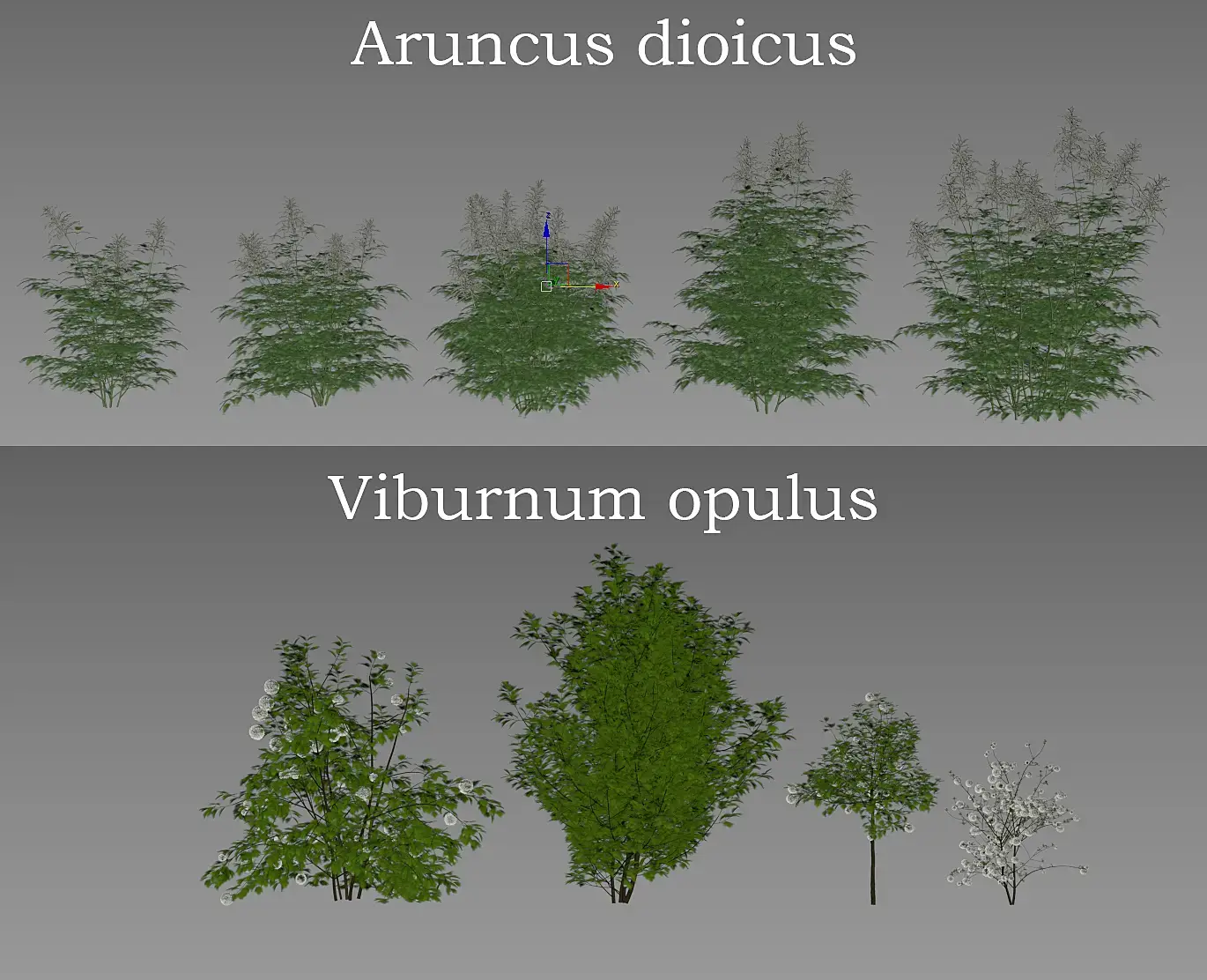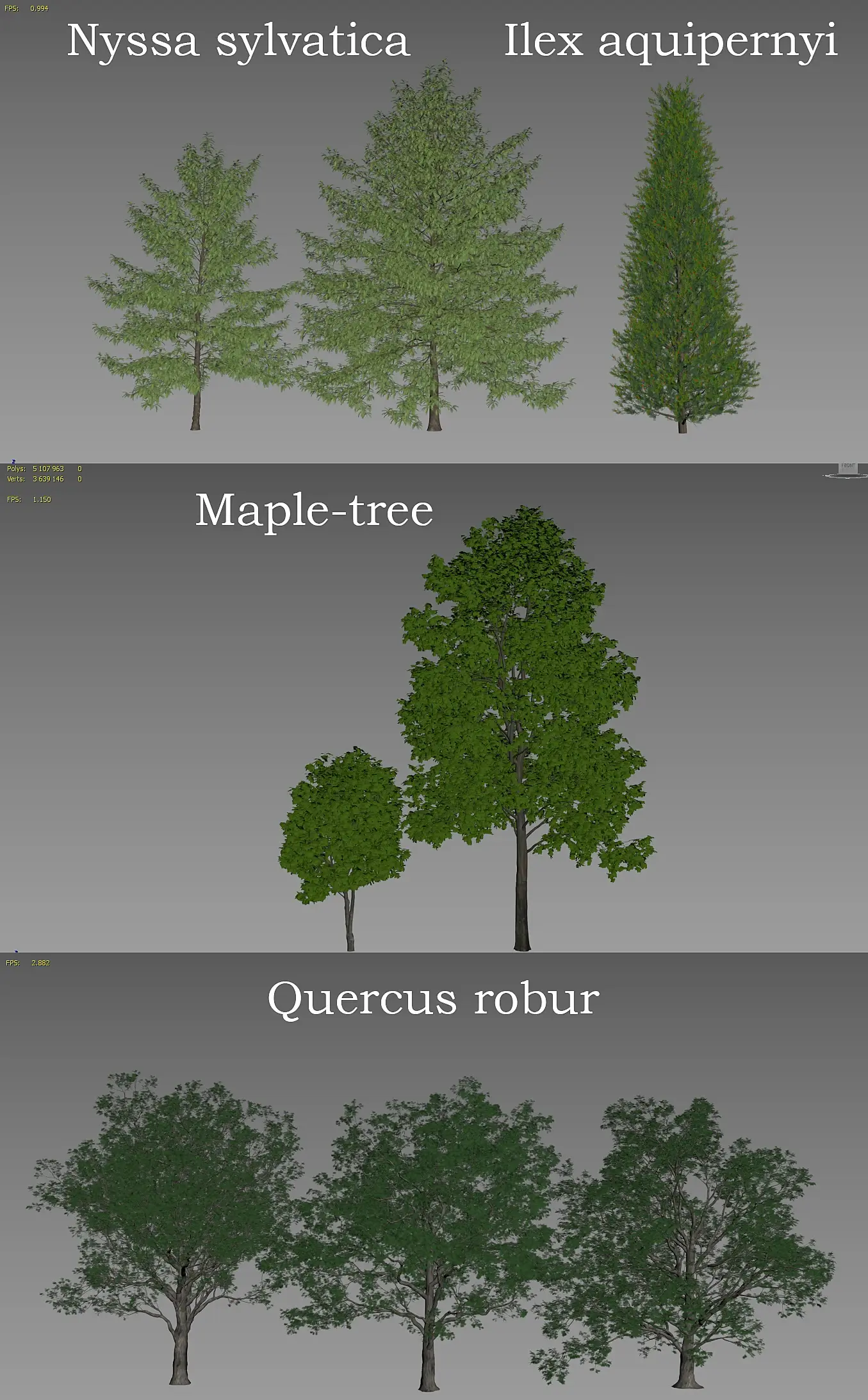 Деревья состояли в основном из дубов, и нужно было подобрать для каждого место с определённой высотой, указанной по плану. Эта растительность только для кадра вида за домом. Ещё большее разнообразие растительности было в парадной части клуба на другом кадре. Полностью не буду описывать каждую модель, только скину картинки, чтобы оценить всё это изобилие. Каждый вид растения необходимо было рассадить на определённых зонах и участках.