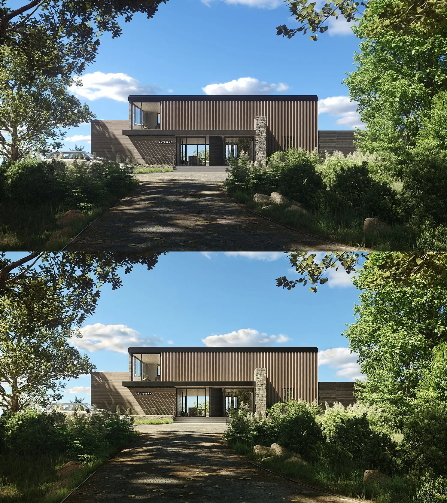 Три дневных ракурса освещались при помощи только HDRI карты. Здесь немного схитрил и использовал для слота Light одну HDRI карту «3DCollective_HDRi_029_1645_+32_8K.hdr», а для слота Direct Visible совершенно другую «176-hdri-skies-com.hdr». Это было сделано для того, чтобы освещение сделать немного обесцвеченным и слегка усилить контраст карты, а чтобы задний фон не менялся и был насыщенным, я его подменил совершенно другой картой. Это можно было сделать и потом в фотошопе, но мне захотелось видеть результат сразу. Передний план постарался затемнить, чтобы акцентировать внимание на дом. При помощи растений создал обрамление по краям и сверху, а 3-ий кадр (вид снизу-вверх на дом) мне особенно понравился. Богатая и пышная растительность очень красиво смотрится при таком освещении и это создаёт необходимую атмосферу.