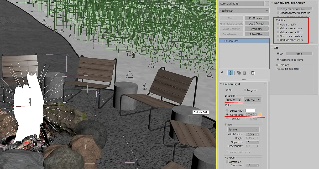 Освещение костра сделано очень просто. Обычная сфера с тёплым светом и выключенными галками в отображении. Размеры его сделал небольшие, чтобы тени были резче. Вот такие настройки костра.