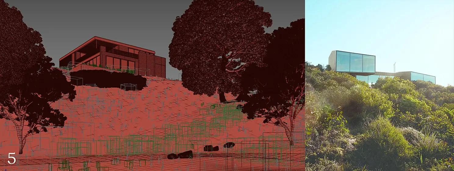 На 5-ом ракурсе захотелось показать небольшой кусочек здания утопающего в разнообразной зелени, чтобы передать всю красоту окружающий природы и пышность зелени. Кусок скалы взял из Megascans и немного его с деформировал модификатором FFD Box.