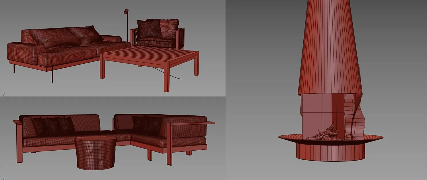Весь проект был разбит на 3 большие сцены: интерьерный ракурс, передний вид с главного входа и задний внутренний вид на кострище. Впоследствии под каждый ракурс была создана своя сцена с уже небольшими изменениями.