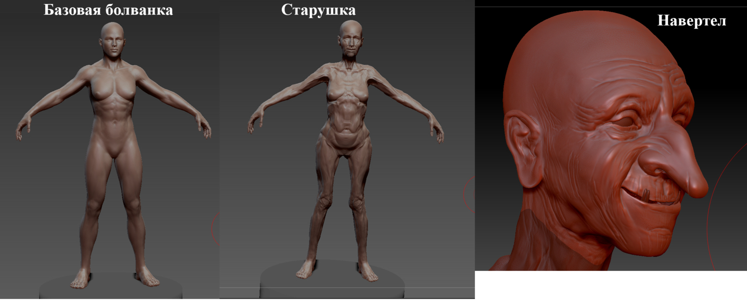 Ну и понеслась. Открываю Zbrush и думаю – делать ли с нуля, или читерить. Решил читерить) Использовал плагин для браша – Zbuilder для базы. Из болванки сделал бабку, а потом, собственно уже вручную поскульптил лицо, клыки и добавил глазки. Тело практически не трогал, так как оно будет в одежде. Слегка пофиксил руки – сделал когти, вены, кое-где добавил морщин.