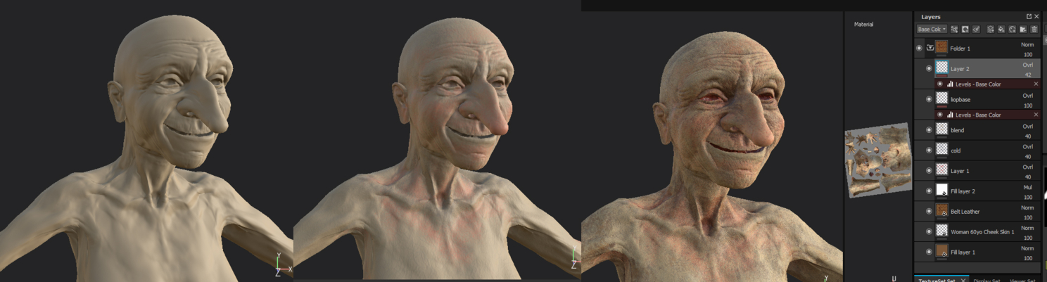 Запекал нормали и раскрашивал в Substance Painter. Ну тут просто – сделал базовую кожу, наляпал теплых и холодных тонов в нужных местах, состарил и затемнил в морщинах, экспортнул в вирей.