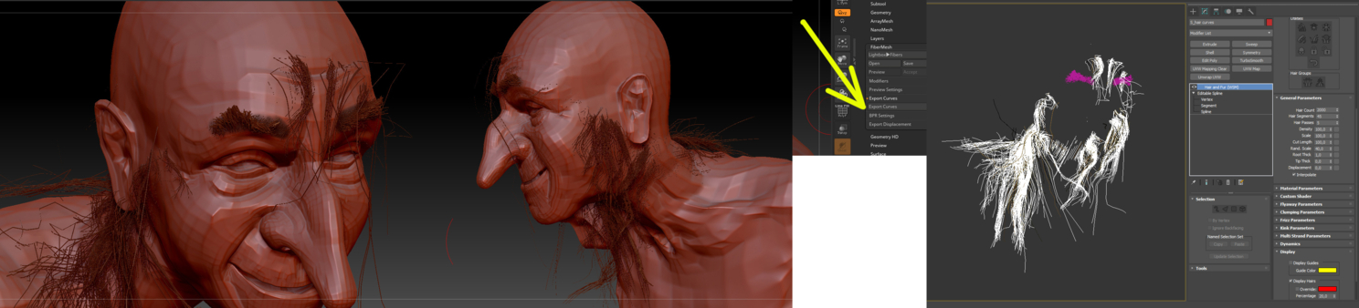 Пришло время для волос. Грузим в браш тело, платок, и верхнюю одёжку – мы будем использовать Fiber mesh. Мне нравится этот инструмент, потому что он достаточно гибкий, и когда править волосы с помощью груминг кистей – они не проваливаются в модель, тоесть они обтекают её, правильно ложась, не пересекая меш. А потом экспортируем волосы в макс как сплайны через Export Curves. В максе просто кладём на эти сплайны модификатор Hair and Fur и… всё) Тут никаких особых настроек. Можно даже выбрать какой то пресет.