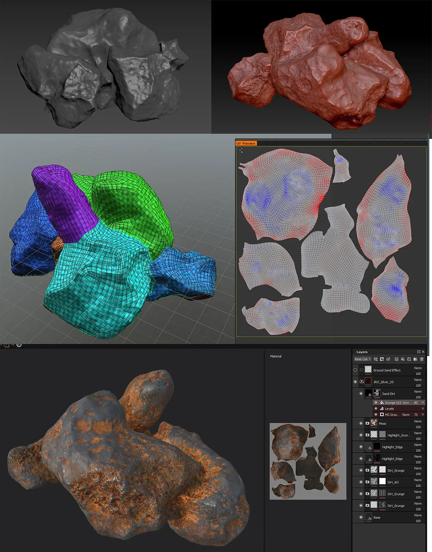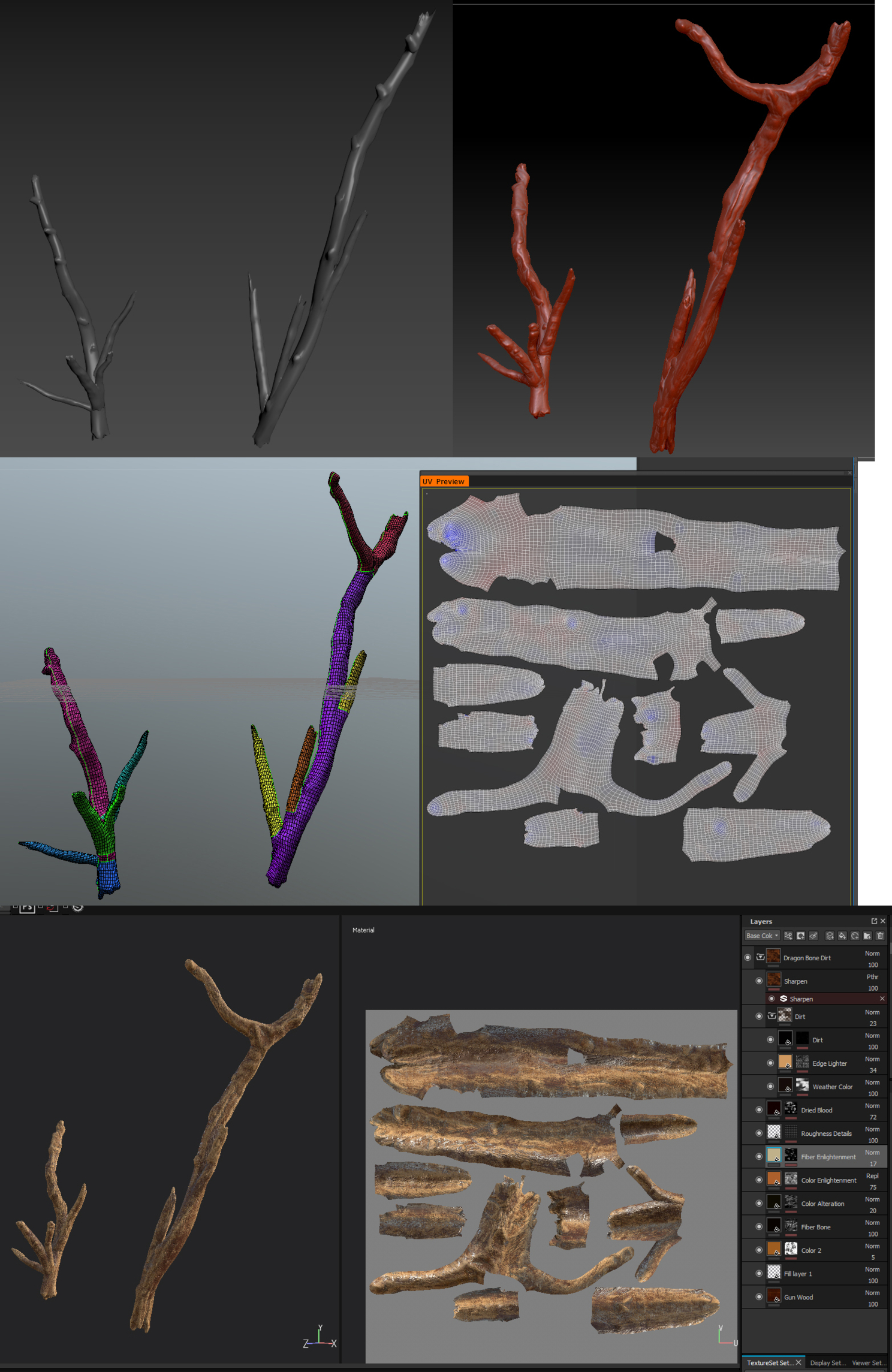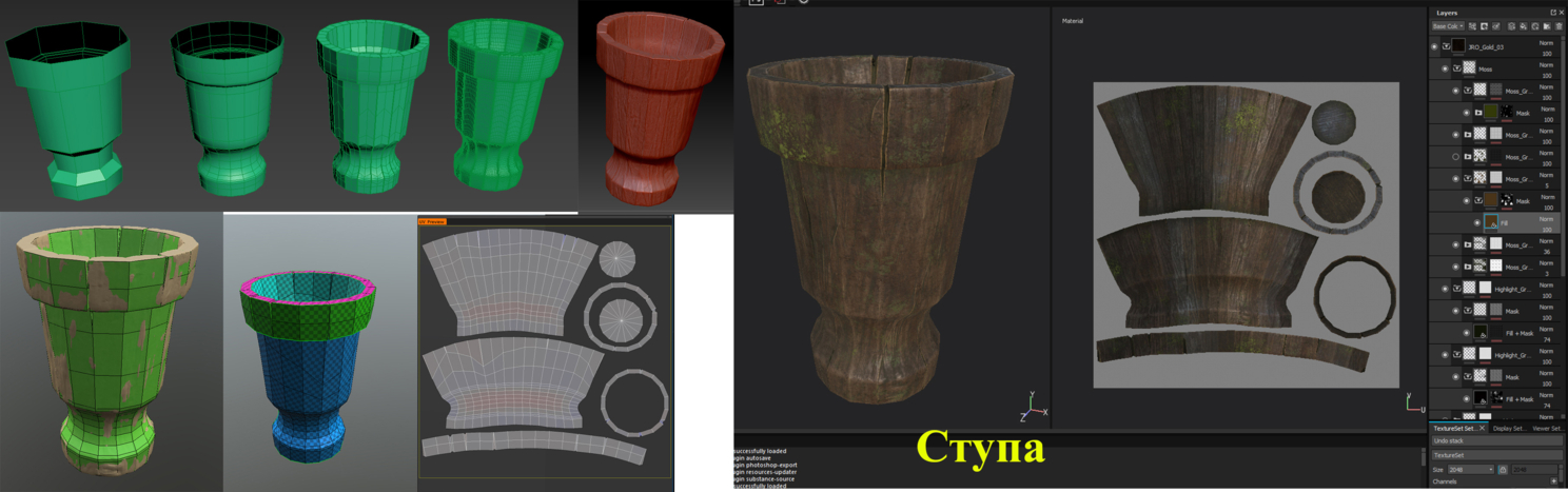 Пришёл черёд стаффа – ступы, палок, камней. Всё делал по стандартной отработаной схеме – полимоделинг в максе, детали в браше, ретопо и развертка в коате, раскраска в сабстансе. Камень и деревяшки делал кстати читерским скриптом Debris maker (время же поджимало, сами понимаете). А, и ретопо камней и палок делал в браше, автоматом Zremesher. Решил, что нету смысла вручную их ретопить.