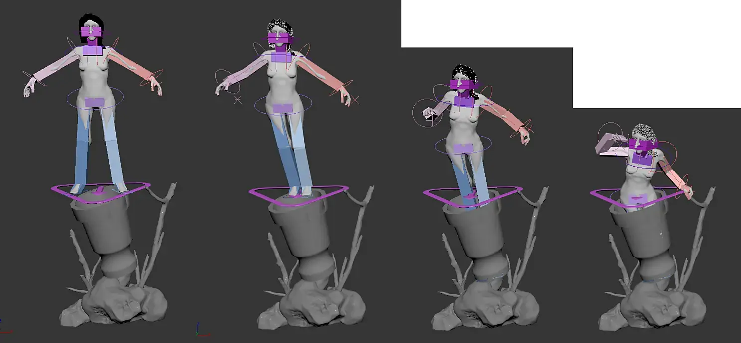 Настало время для сборки. Это было самым интересным приключением - когда на руках уже имеются раскрашенные модельки, и остаётся только заанимировать и собрать всё в кучу. Собрал сначала стафф, поставив рядом бабульку для дальнейшей анимации. Без одежды пока. По задумке она должна приземлиться в ступу, по пути задрав платьишко. Значит, ставим её в начальное положение.