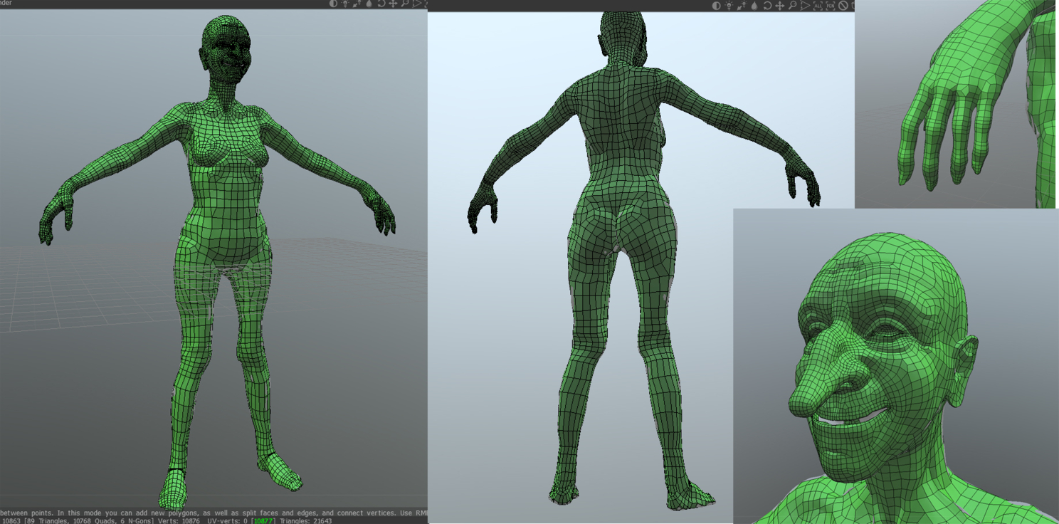 Сразу же решил сделать ретопологию в 3d coat. Захотел делать «правильно», типа для анимации. Тут уже вручную расставлял полигоны. И сразу же наткнулся на ошибку. На будущее: если вы хотите делать ретопологию, то ни в коем случае не отключайте симметрию в браше. А то я делал асиметричную мимику лица, а в коате столкнулся с проблемой – там полигоны строятся только на одной половине – а на другую проецируются зеркально. Так вот ретопо лица не совпадало с хайполи лицом, так как оно было несиметричное из браша. Пришлось пару часов ещё вертеть это всё дело, уже без симетрии. Это очень напряжно, товарищи, не делайте так. Болванка под ретопо должна быть симетричной!