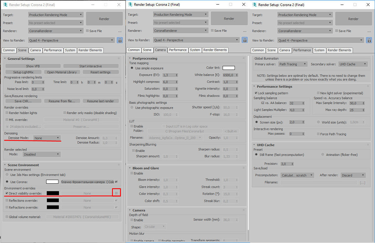 Чтобы не было потом проблем с изменением фона в фотошопе, в настройках рендера в слоте Scene Environment включил галочку Direct visibility override и снял галочку с карты, это необходимо, чтобы на картинке вместо фона был черный цвет. Тогда у деревьев не будет проблем с белой каймой и небо прекрасно меняется в фотошопе на любой другой фон. Денойзинг не выключаю, так как использую его локально в фотошопе при помощи Topaz Denoising. Дополнительные карты и слои были следующие: Reflect, Refract, ID mask. WireColor, ID Mask Materials, Alpha, ZDepth.