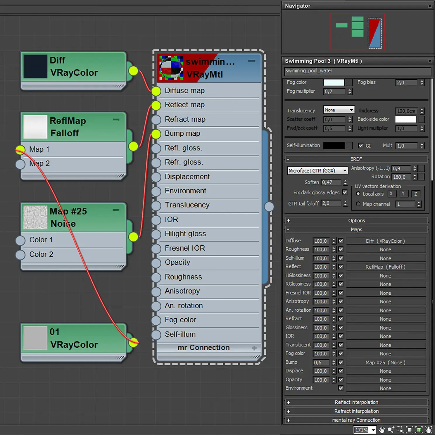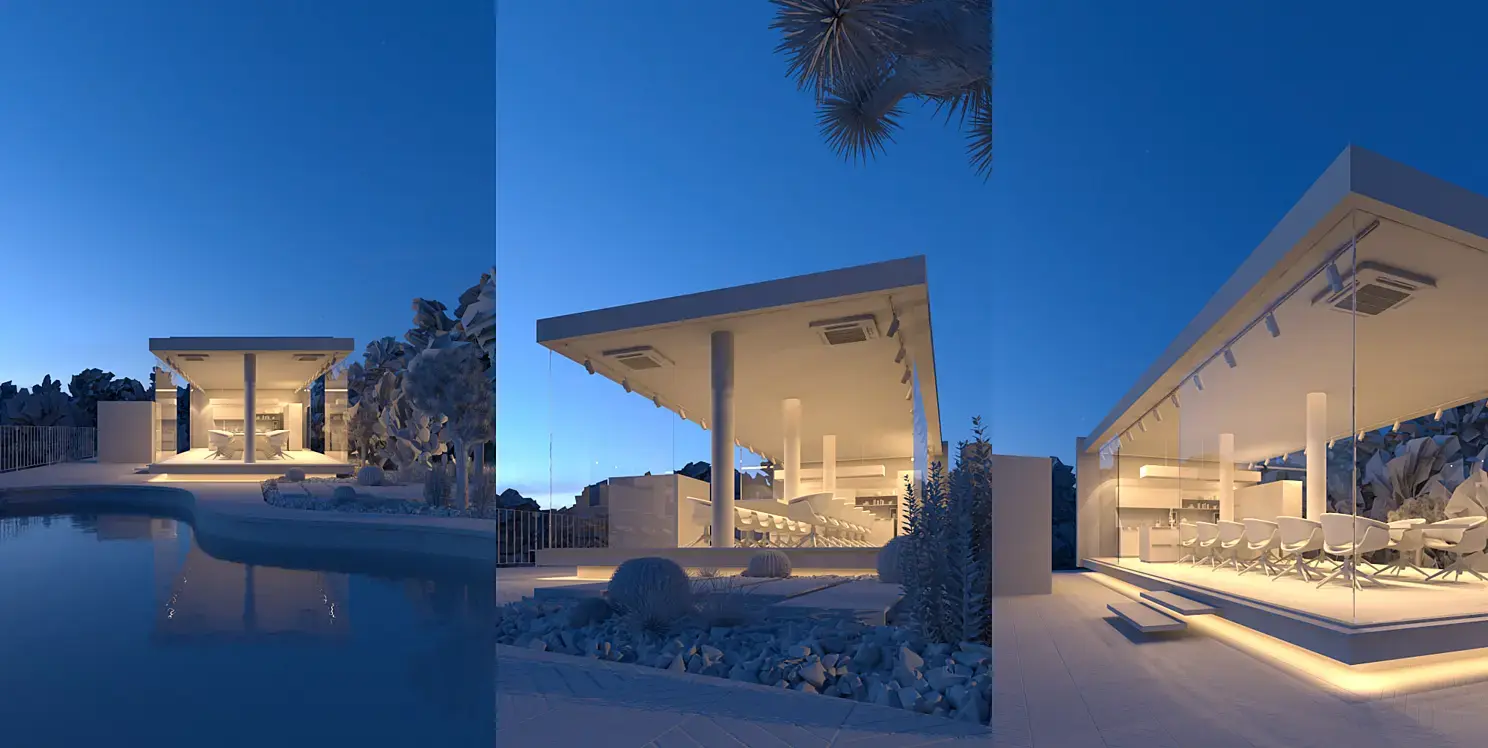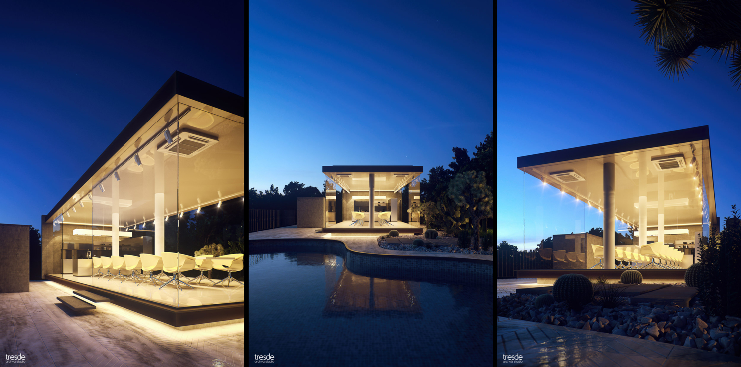 Для экстерьера я использовал «dome light» связанный с «HDRI» картой (Peter Guthrie’s PGSKIES 2028), для интерьерного света я использовал смесь направленных источников света с «V-Ray» панелями. Маленькие лампы присоединялись к потолку и имели «V-Ray Light» материал для симуляции лампочек и фотометрический свет с прикреплёнными IES файлами.