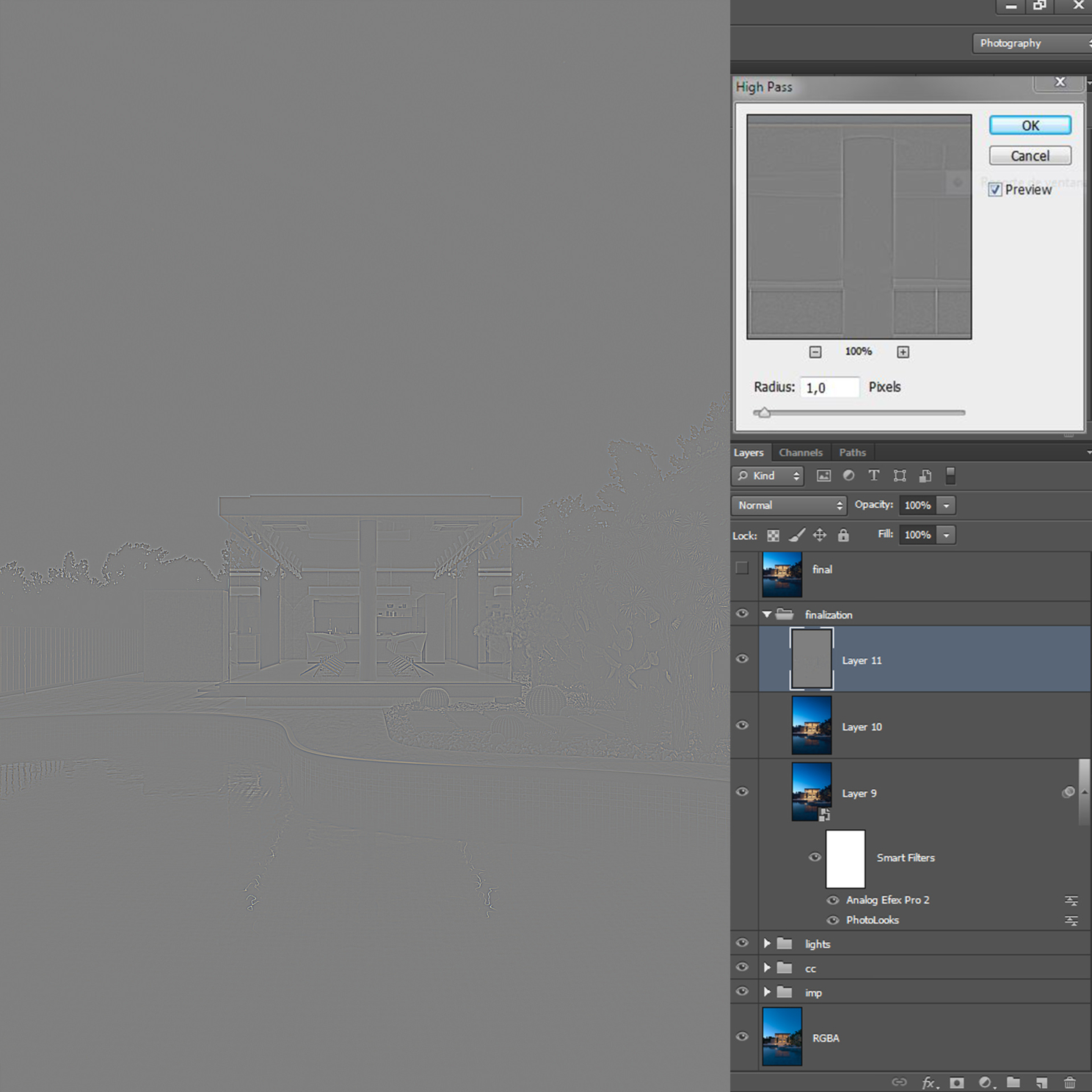 В качестве финальной ступени Вы можете использовать «high pass filter» для того, чтобы увеличить чёткость изображения и гарантировать себе то, что при уменьшении картинки Вы не потеряете какой-либо информации.