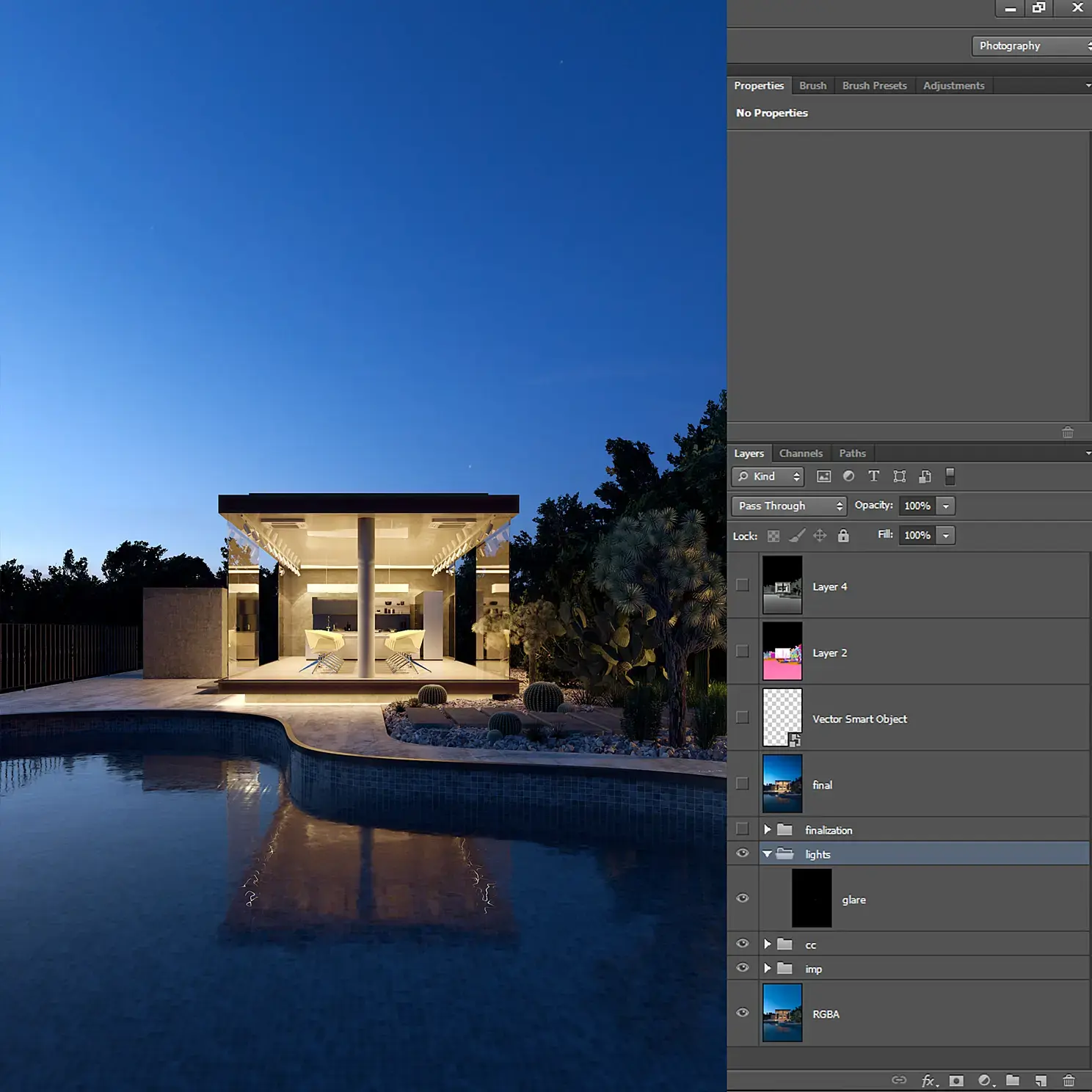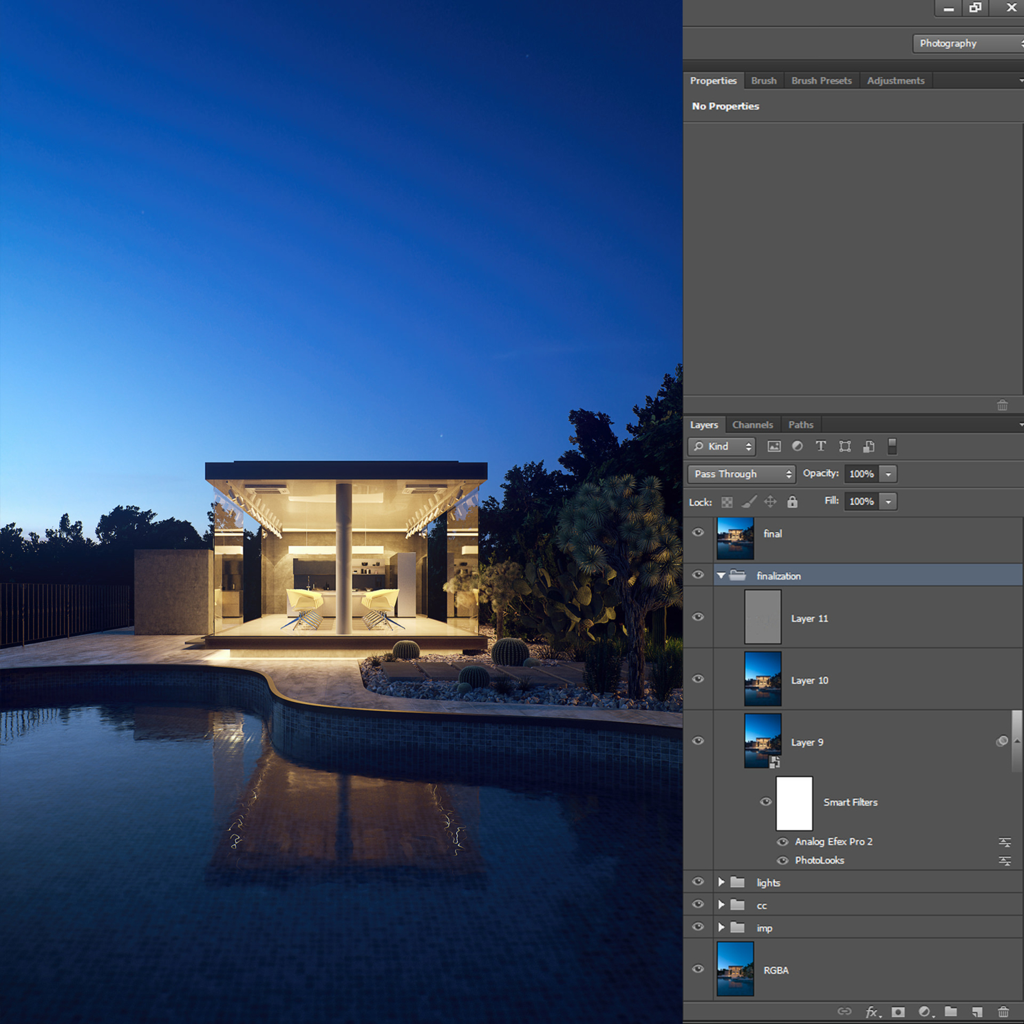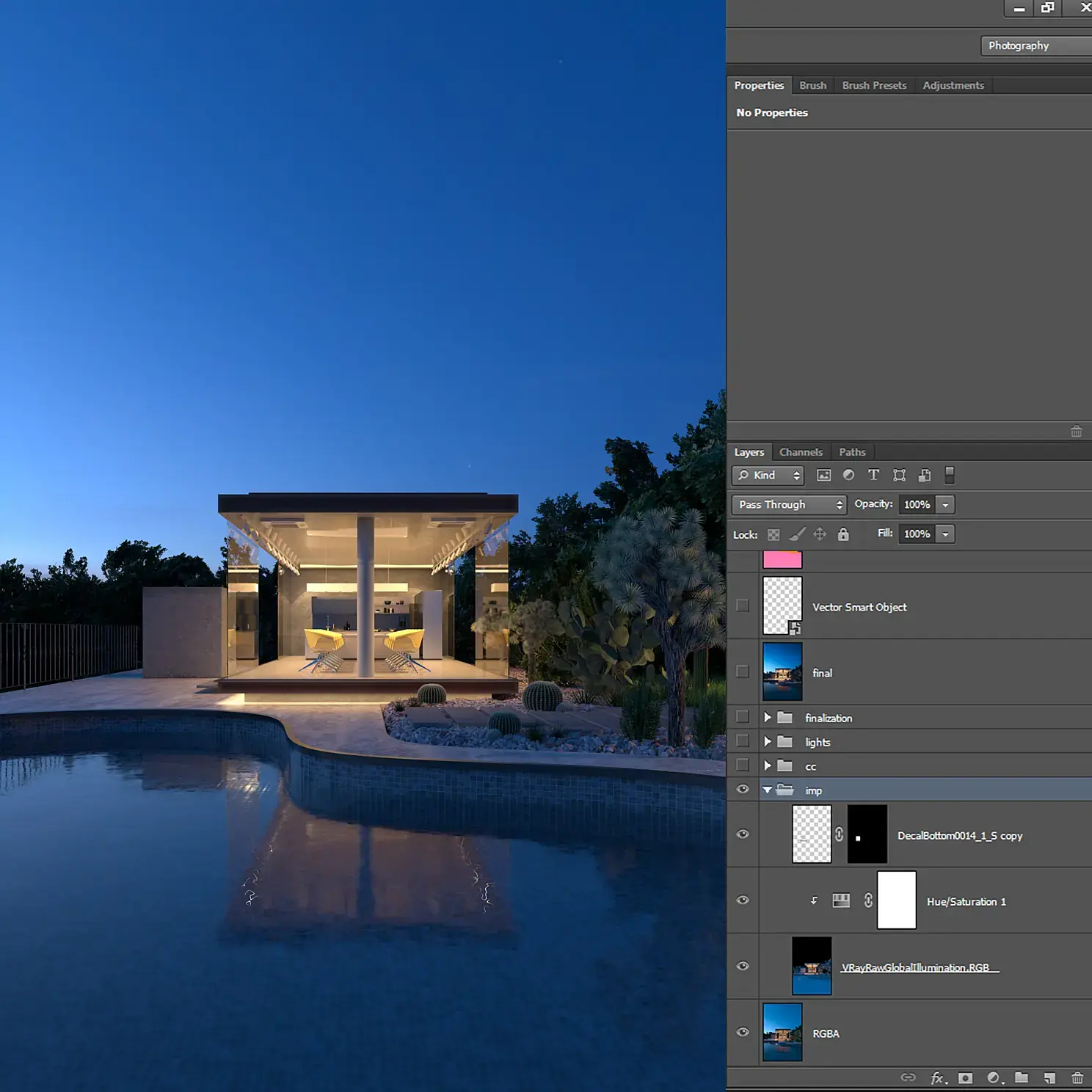 В большинстве случаев я предпочитаю использовать «V-Ray» рендер элементы, которые позволяют быстро выделять объекты (object id), контролировать свет, контраст, отражения и прозрачность, но именно для этого проекта я использовал только «V-Ray raw Global Illumination» пасс.