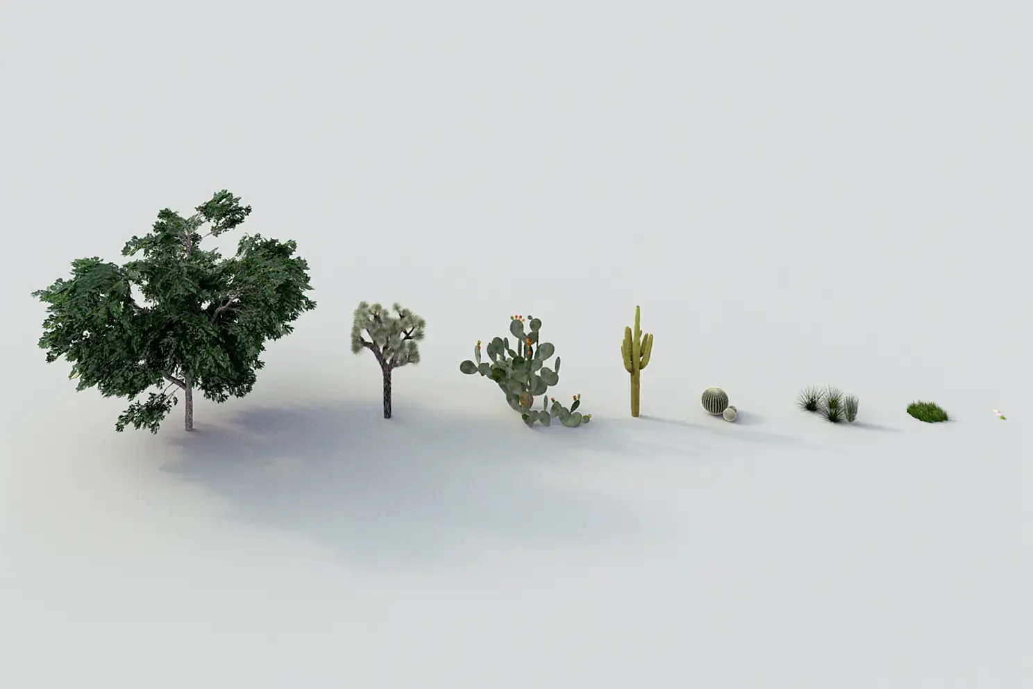 Немного о ландшафте и создании окружения. Я использовал «ForestPack», чтобы генерировать и рассеивать гравий, траву и окружающие деревья. Специфическую растительность, близкую к архитектуре (кактусы и маленькие деревья), я располагал вручную, стараясь следовать композиционным принципам.