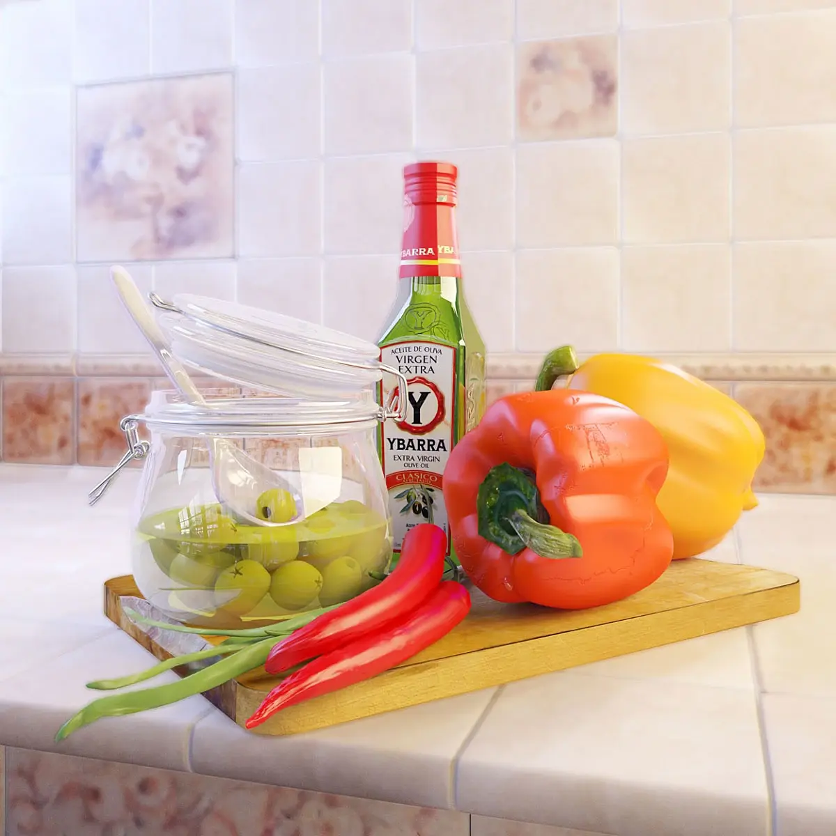 Как и любая творческая работа, эта началась с вдохновения. Весной 2012 года, после длительного перерыва я вернулась к акварельной живописи, и это занятие меня увлекло. Однажды, я искала предметы для рисования на тему "Витаминный натюрморт". И в моей голове, постепенно, сложился яркий образ из красного, яркого зеленого, желтого. Оставалось дело за малым - поход в магазин за интересующим меня ярким товаром. Там были приобретены болгарские перцы двух цветов и перцы "Чили". Долго искала подходящую бутылку с оливковым маслом, чтобы она соответствовала моим требованиям. Добавила зелени, хотела использовать еще укроп, но остановилась на пучке зеленого лука. Всё остальное нашла дома. Предметы я подбирала очень тщательно, что они удачно вписались в композицию и замысел. Потом бережно расставила их. В результате, натюрморт в акварельной технике был успешно написан. Но в процессе рисования меня не оставляла мысль, что я хочу воплотить в 3д графике все это великолепие. Красивая форма перцев, цвета, сама композиция, разные интересные материалы - вдохновили меня на создание этого натюрморта. Спустя год, я понимаю, что такое вдохновение приходит не часто. По крайней мере, пока, оно меня больше не посещало.