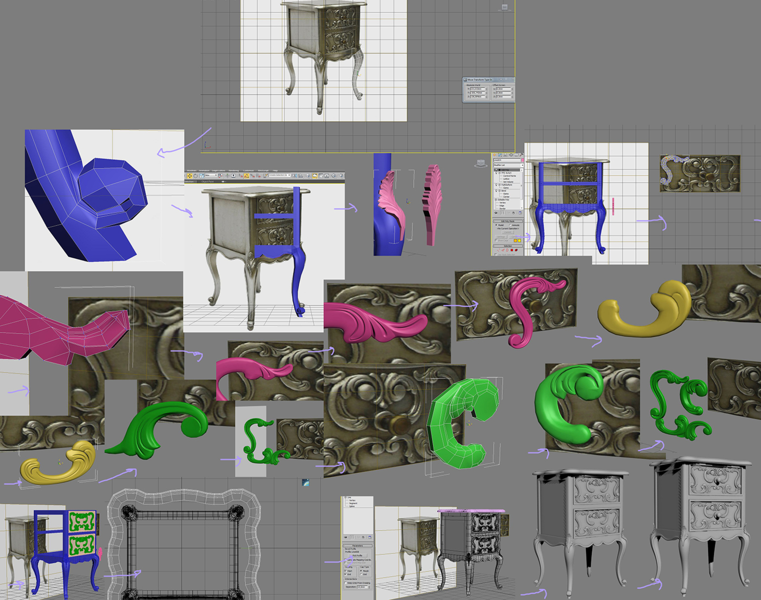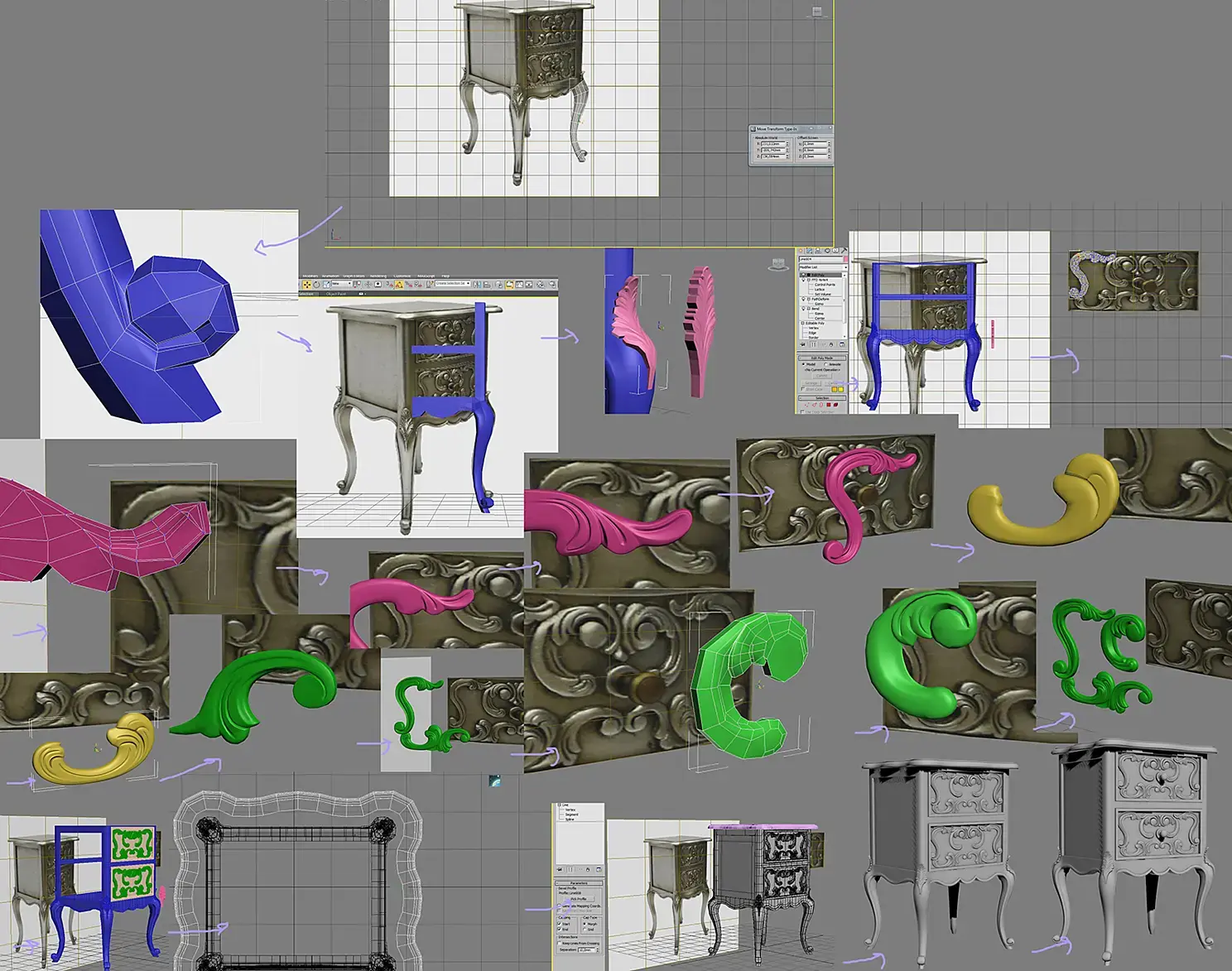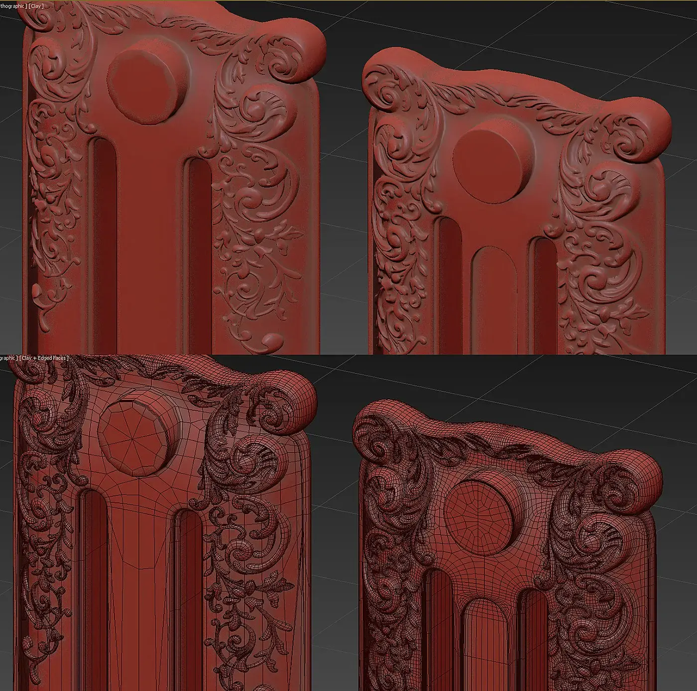 И вот однажды я решил совместить все свои модели, старые и новые, в одной работе, так как они могли создать вполне приличный интерьер. И тут начались муки, что сделать главным, что второстепенным, так как все модели могли стать центром композиции. Потому что это были качественно проработанные, самодостаточные модели, которые требовали небольших деталей. Некоторые этапы своей работы над моделями я скринил, поэтому есть возможность заострить внимание именно на моделинге.Радиатор, который не был отрендерен, но был частью данного проекта, потом он обрел себя в"Библиотеке". На скрине присоединение узора к базовой геометрии "до и после".