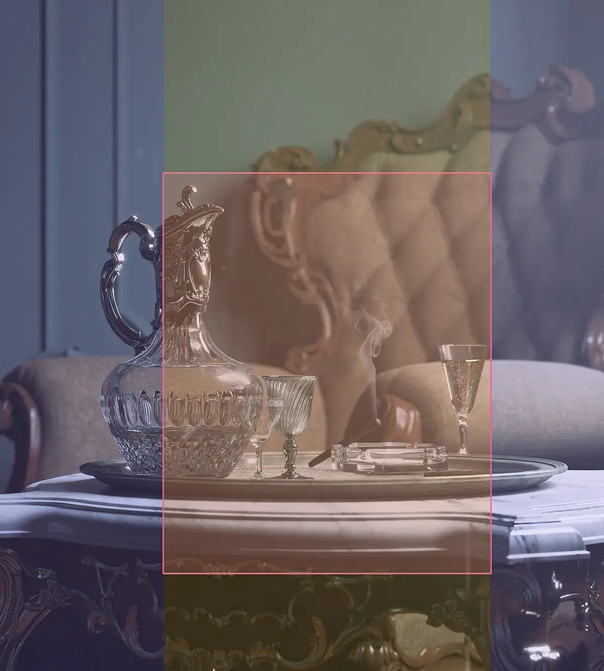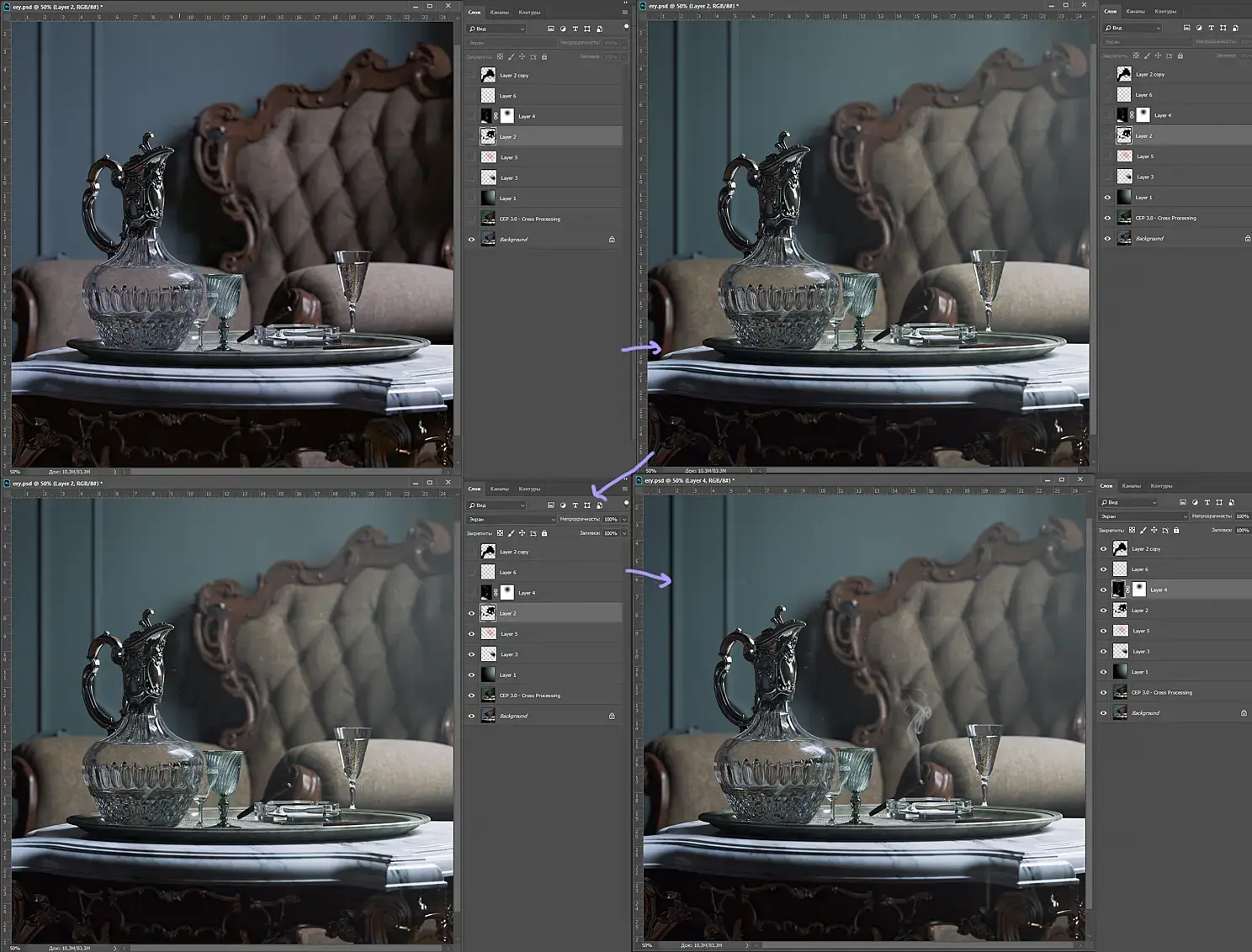 «Графин с креслом» Хотелось в итоге сделать что-то атмосферное, эффект присутствия, так как другие кадры были немного «сухими» в этом плане. Имне хватало жизни. Но здесь на мой взгляд все удалось. Сложный столик и кресло, которые так целиком и не влезли ни в один кадр, стали частью одного хорошего. К слову сказать, резная часть кресла, не очень выходила по материалу, не удавалось поймать красивый цвет и отражения. Поэтому отличным решением было его просто заблюрить :D. Чтобы дать эффект присутствия, надо просто остановить движение в кадре. На данном рендере это дым сигары и пузырьки в бокале. Также добавил немного летающих частиц и пыли, чтобы придать атмосферы. Всю остальную работу делает графин.Особенности кадра: Постобработка была практически идентична с другими ракурсами, но есть отличия. На скрине вы можете увидеть этапы работы. Возможно на них упущены небольшие движения curves, но незначительно. Итак, первым делом сделал цветокор через смешение с готовым решением из color efex pro (crossprocessing). Ушел в зеленый, 40% прозрачность. Добавил немного дымки со стороны окна через градиент, смешанный по screen 40%. Третий этап. Через текстуру dust (любая чб картинка с черным фоном и мелкими белыми частицами пыли) добавил частиц. Затем с помощью инструмента «палец» немного размазывал частицы, чтобы дать движения им. На последнем этапе добавил дым, тем же способом, через чб картинки и смешением по screen. Но в верхней части дым должен рассеиваться, поэтому по маске немного убрал насыщенность. Также слоем specular местами добавил бликов.