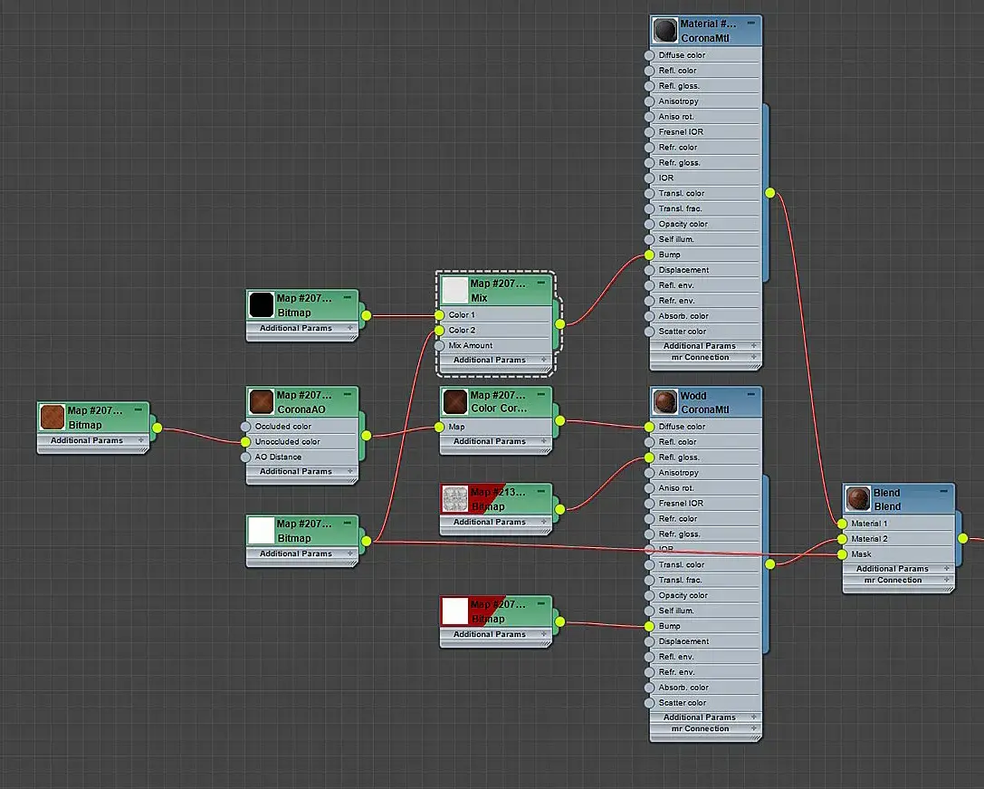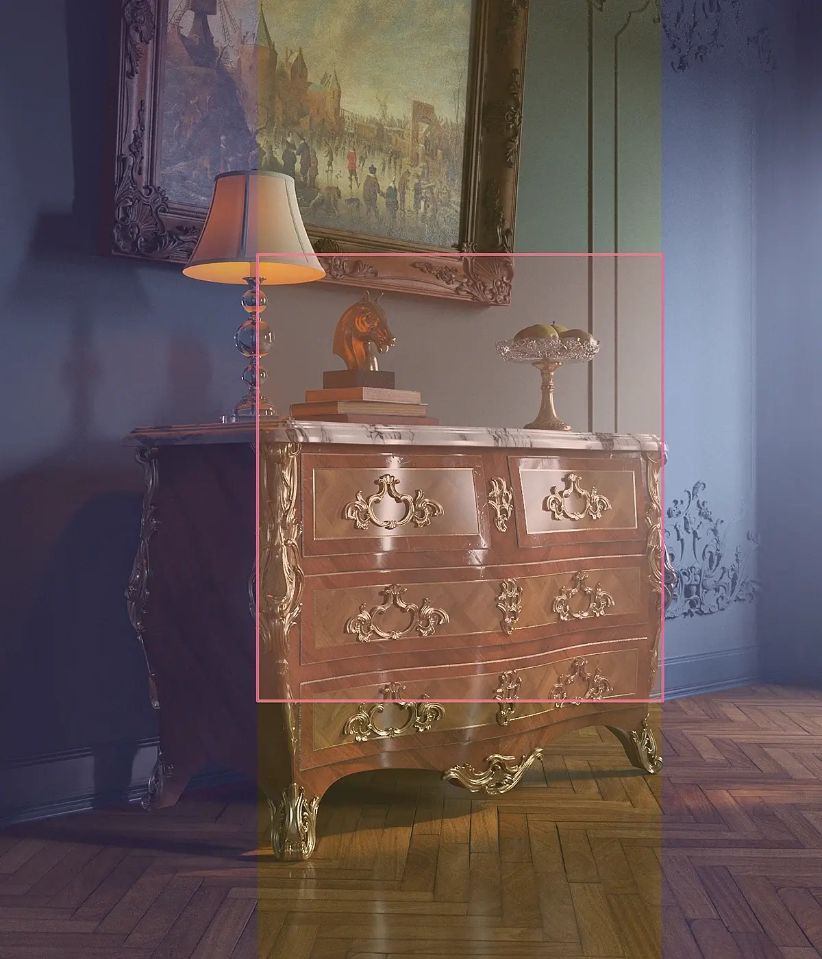 «Комод»Кадр очень похож на «камин». Его я не стал вытягивать ради оставшегося куска рамы за кадром (мое сердце скрипело). А для того чтобы сделать цвет комода более насыщенным, был использован прием теплохолодности. На темном и холодном фоне проще сделать красивый, теплый свет от настольной лампы. Даже при такой детализации комода, пришлось хорошо поработать над материалом дерева, сделать его чуть состаренным и в меру глянцевым. Детали на комоде немного уравновешивают композицию. Особенности кадра: состаренные материалы я обычно делаю по одной и той же схеме. Обычно это Blend материал. Первый слот дерево, второй «грязь». Дерево всегда с AO. Карты грязи, вмятин на маске, обычно дублируются на Bump, чтобы подчеркнуть «грязь».