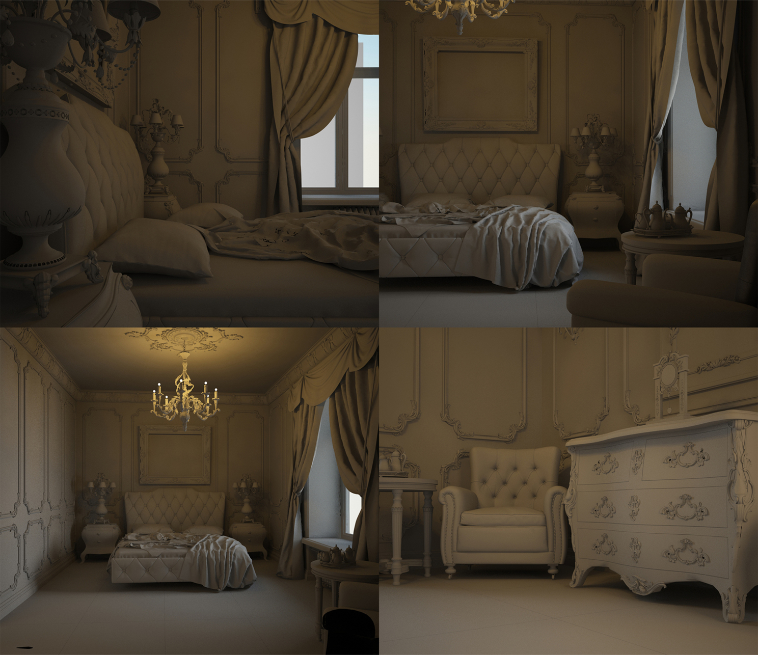 скачать скрины моделинга кроватиТакже можете по ссылке скачать процесс создания кровати, которая все таки была отрендерена :D И так после создания 3-4 интерьеров со всем этим добром, я просто решил разделить работу на самостоятельные картинки. Так как объем работы уменьшается как и размер интерьера, что мне и было нужно. А теперь давайте разберем, из чего состоит работа. Мы рассмотрим 4 основных кадра.