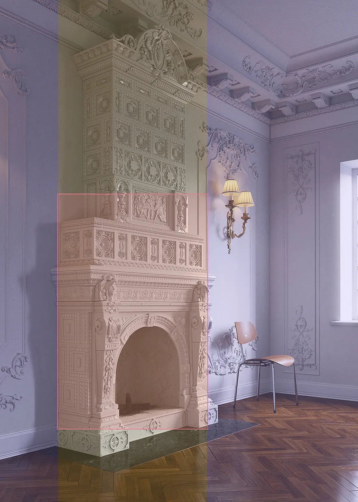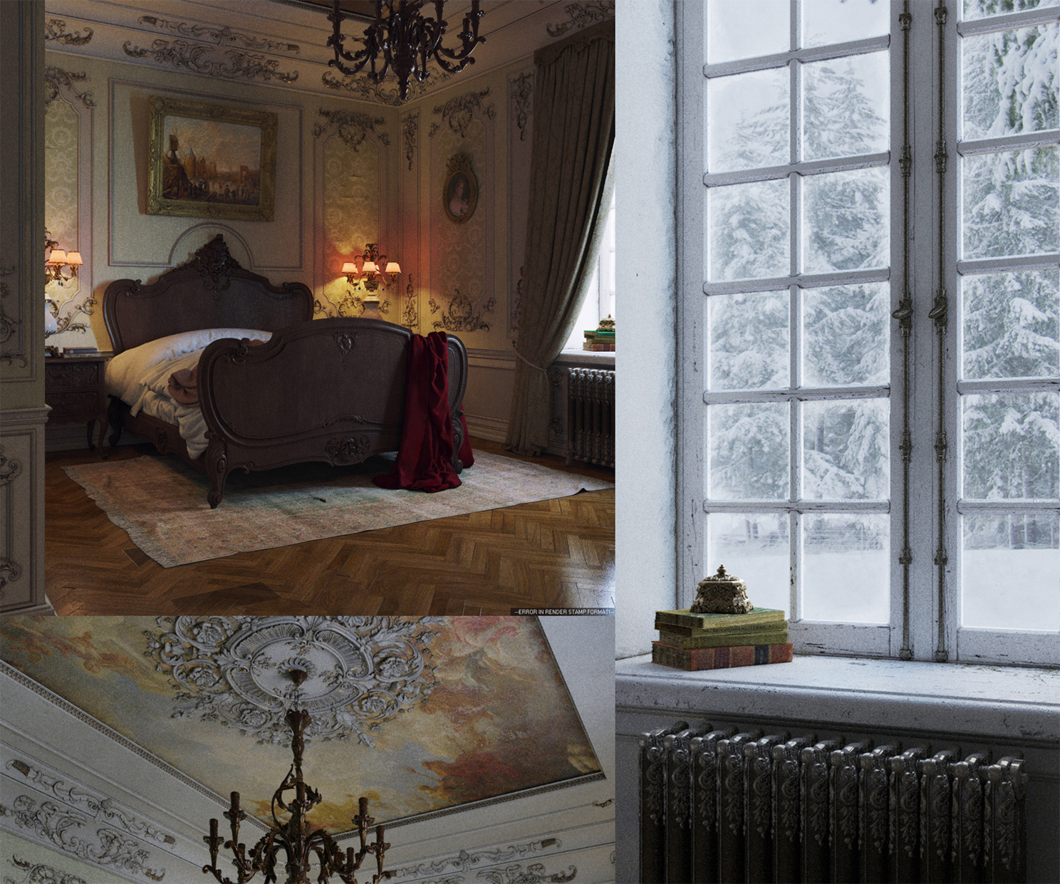 Всем привет. Меня зовут Дмитрий Щука и я хотел бы вам рассказать о своей работе «Каминная». Для понимания откуда растут рендеры , небольшая предыстория к данной работе. Я начал заниматься 3д с 2008 года и всегда любил моделить резные классические элементы. Работая на удаленке, выполнял различные сложные модели и однажды почувствовал, что будто бы созрел для сложной работы в классическом стиле. Но как оно обычно бывает, идея пришла не сразу как и скилуха. Все началось с небольшой комнаты с одним окном и какой-то неясной концепцией. Так как не хватало наполнения, сложно было сразу готовыми объектами создать образ. Сильно резные кровати делать боялся, на тот момент умения не позволяли, а стеганные не подходили по стилю. Поэтому работа заходила в тупик. И после нескольких тестов материалов и попыток сделать что-то красивое, работа отправлялась на «отдых». Еще одним камнем преткновения стали мощности компьютера, которых катастрофически не хватало на протяжении всей работы над интерьером. Первые тесты можно увидеть на фото ниже.