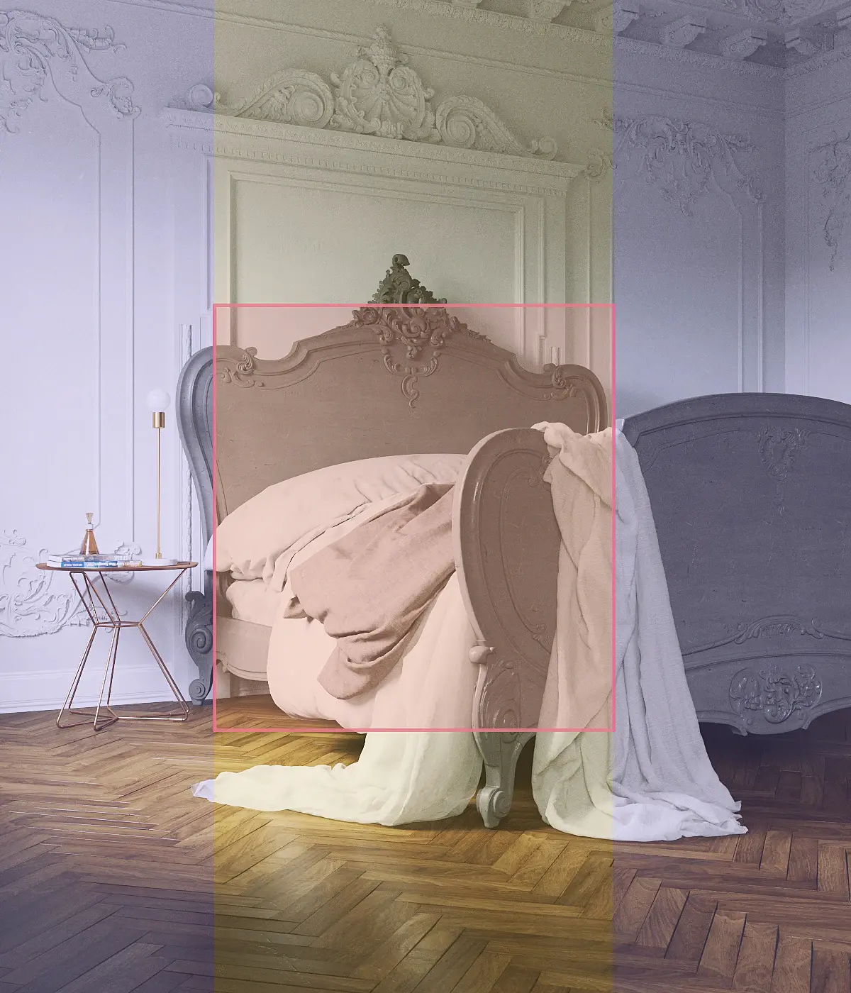 «Кровать» Желание вместить всю кровать целиком в кадр, раз за разом оборачивалось фиаско (люблю я чтобы весь предмет был виден в кадре). Было просмотрено много референсов и на одном из них я нашел очень похожую кровать. На фото также был столик на металлической основе. Все что мне оставалось сделать, это просто сделать похожий стол и добавить аксессуаров на него. Лепнина и пол перекочевали со стен с камином, чтобы сохранить ощущение единого пространства. Собственно они будут на всех кадрах. Ткань на переднем плане решил сделать легкой, чтобы немного разбавить остальные. Столик стал акцентом на данной картинке.Особенности кадра: крупные сложные формы лепнины и кровати дублируют друг друга. Забыл убрать стекло, поэтому после 10-часового рендера было много шума :D
