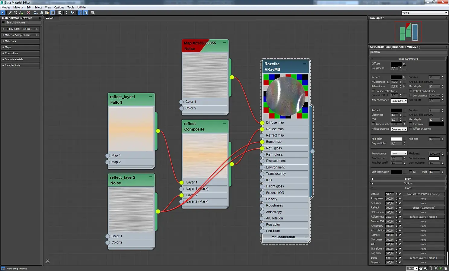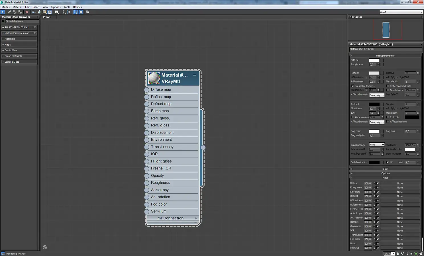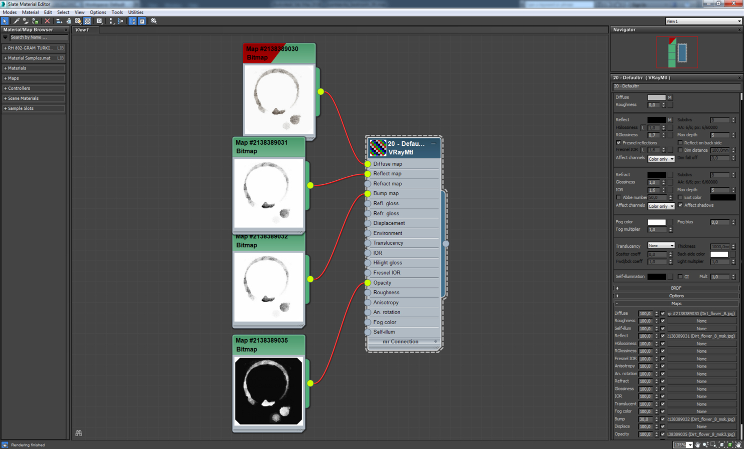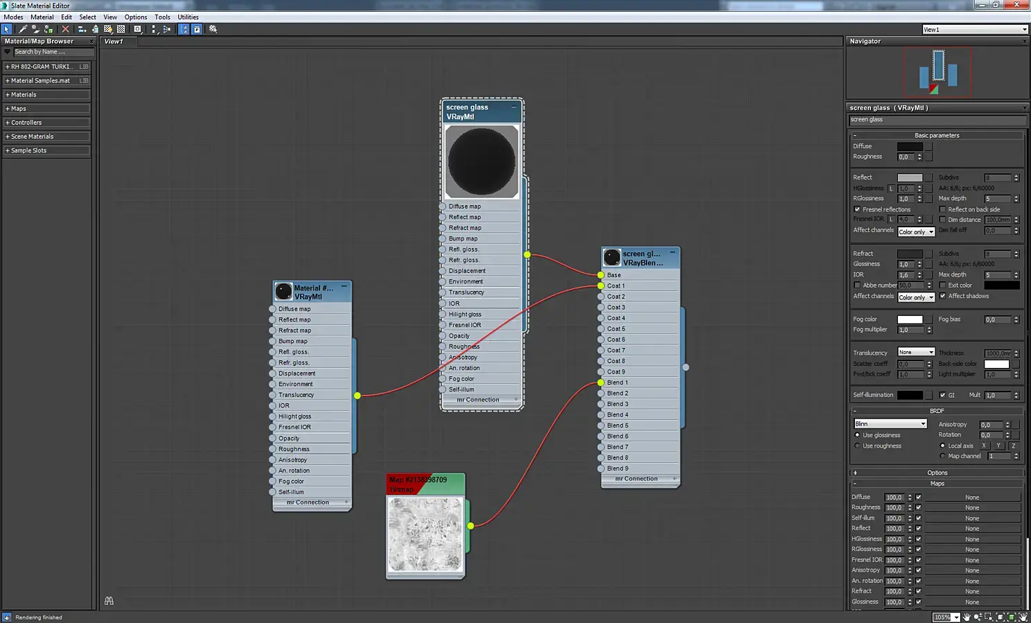 Материал экрана телевизора. Это VrayBlendMtl, в котором смешиваются два материала стекла, отличающиеся цветом и параметром Rglossiness. Аналогично сделаны зеркала с отпечатками пальцев, экраны мониторов, загрязненное оконное стекло.