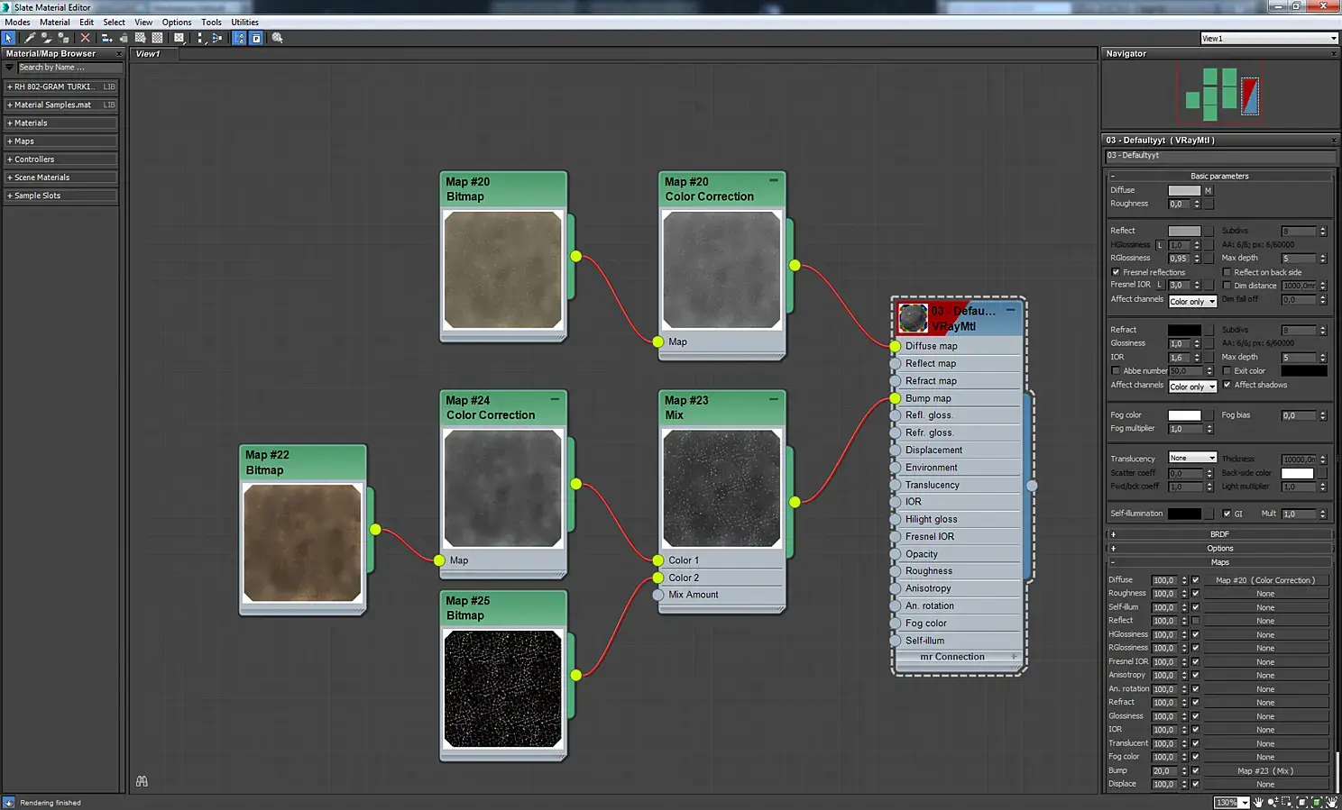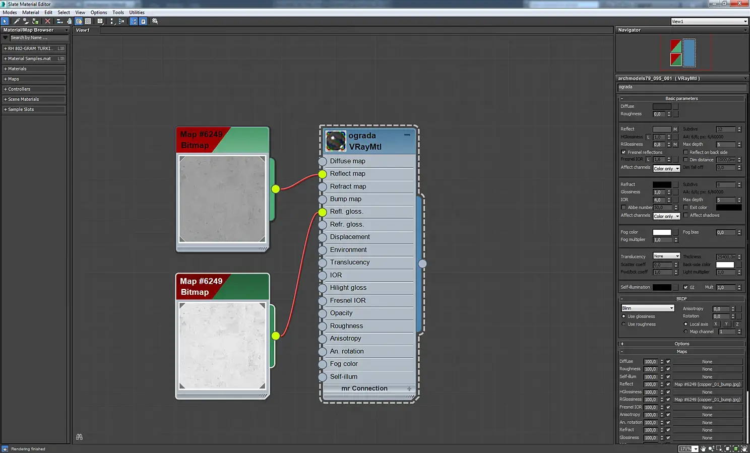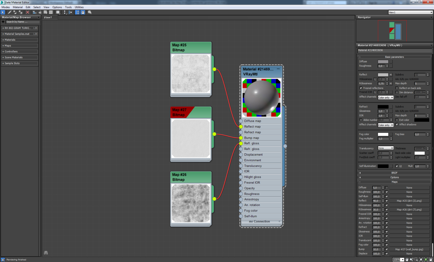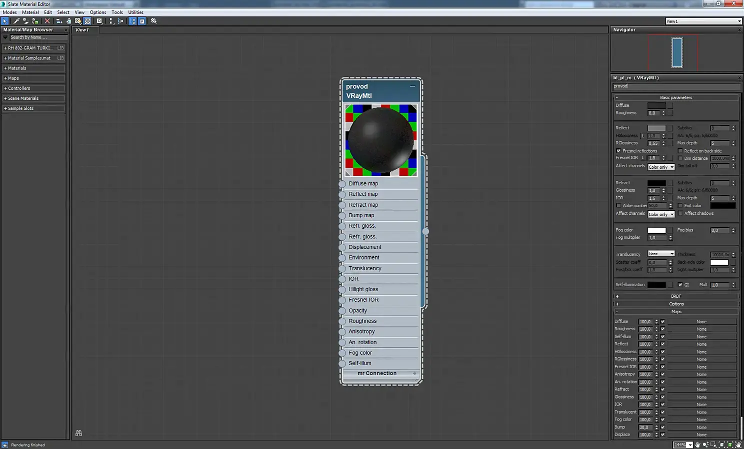Материал экрана телевизора. Это VrayBlendMtl, в котором смешиваются два материала стекла, отличающиеся цветом и параметром Rglossiness. Аналогично сделаны зеркала с отпечатками пальцев, экраны мониторов, загрязненное оконное стекло.