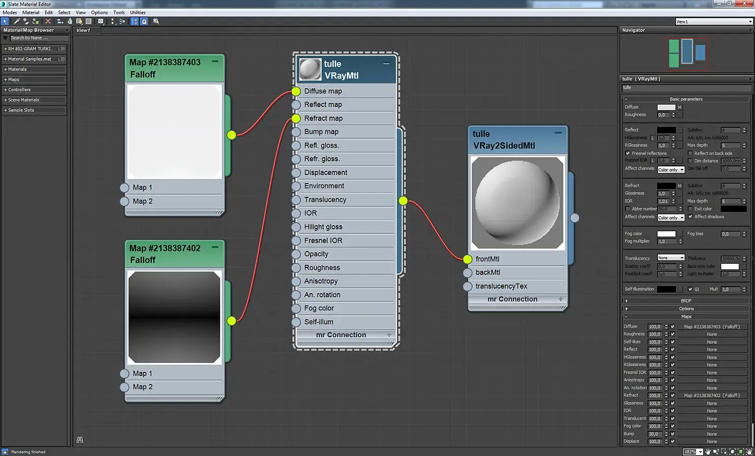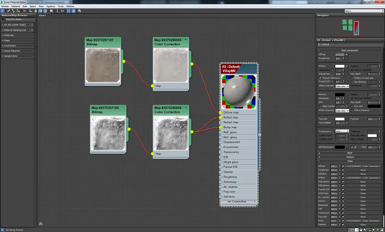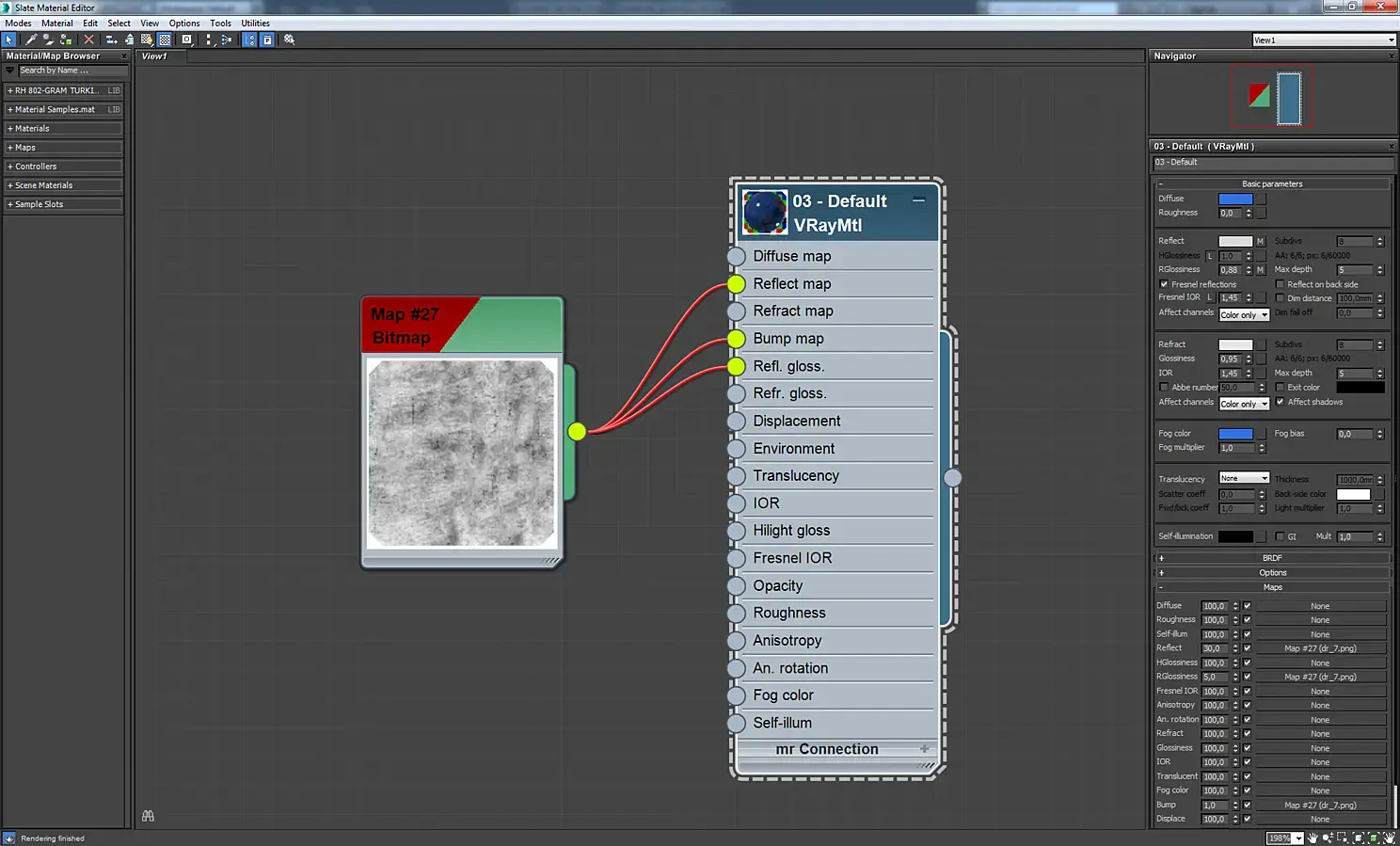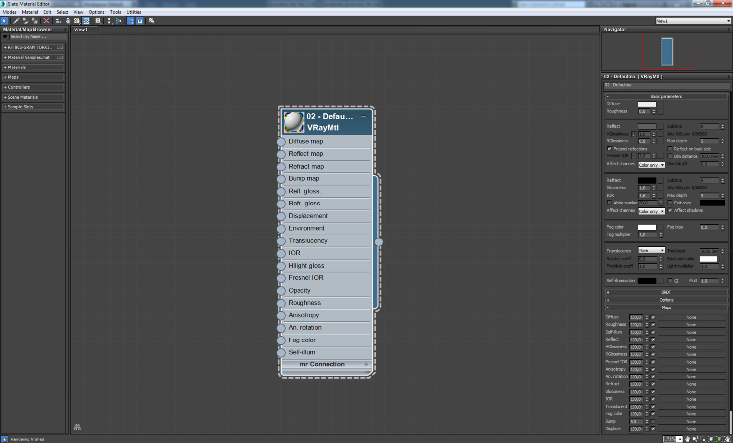 Материал экрана телевизора. Это VrayBlendMtl, в котором смешиваются два материала стекла, отличающиеся цветом и параметром Rglossiness. Аналогично сделаны зеркала с отпечатками пальцев, экраны мониторов, загрязненное оконное стекло.