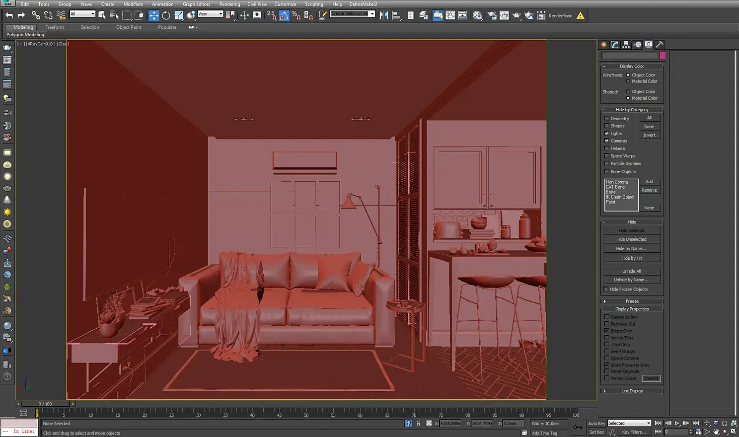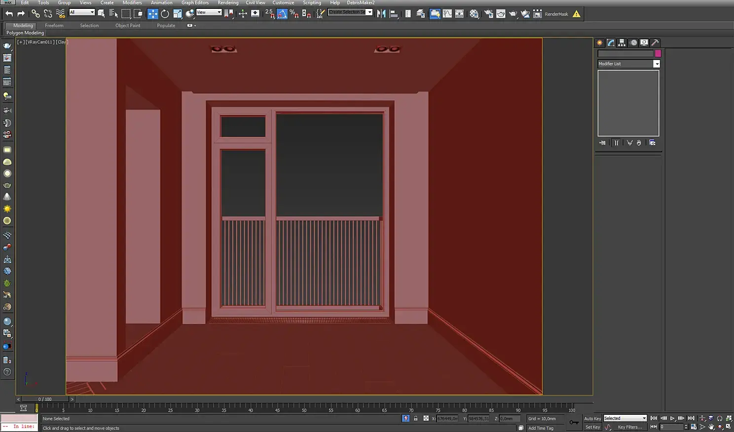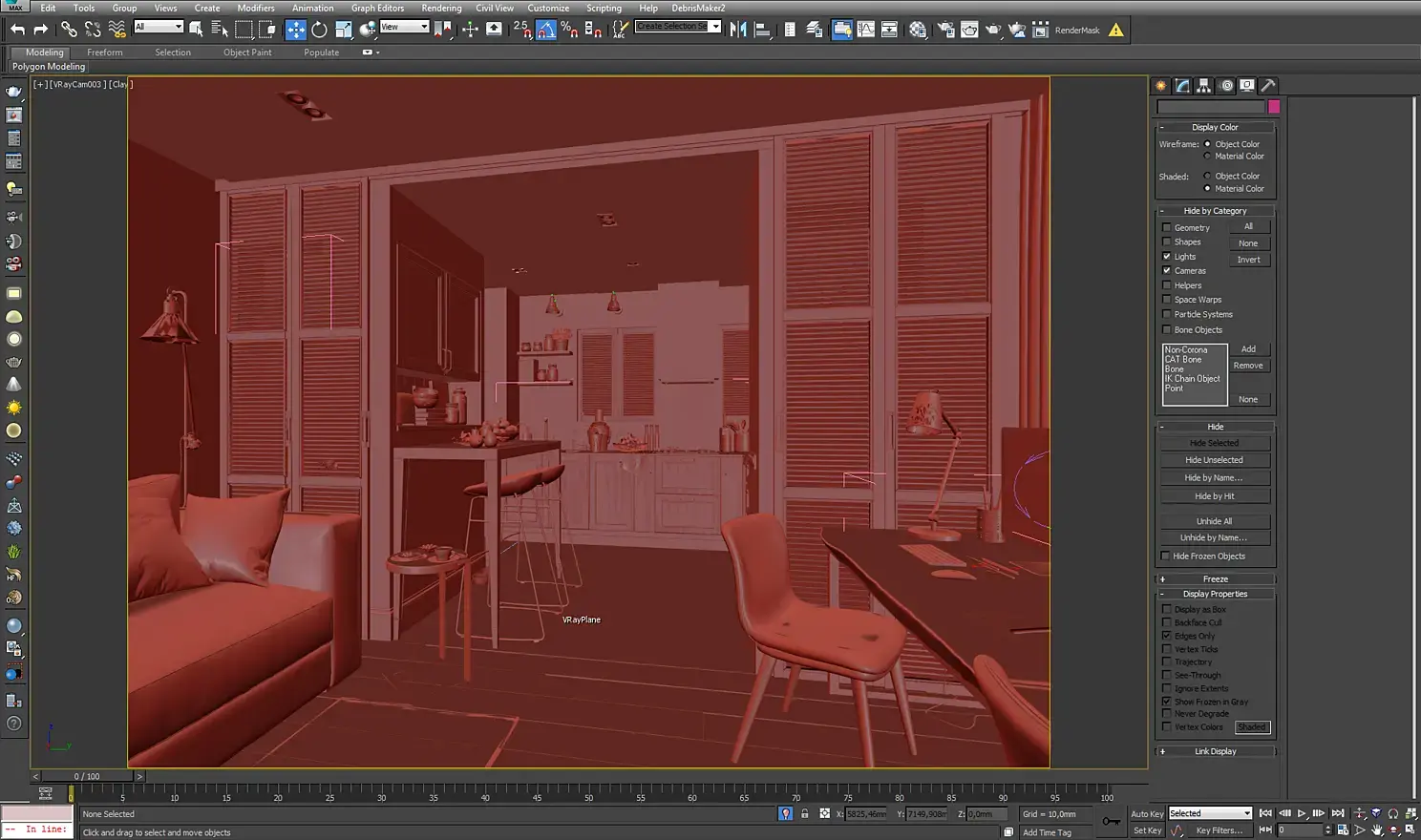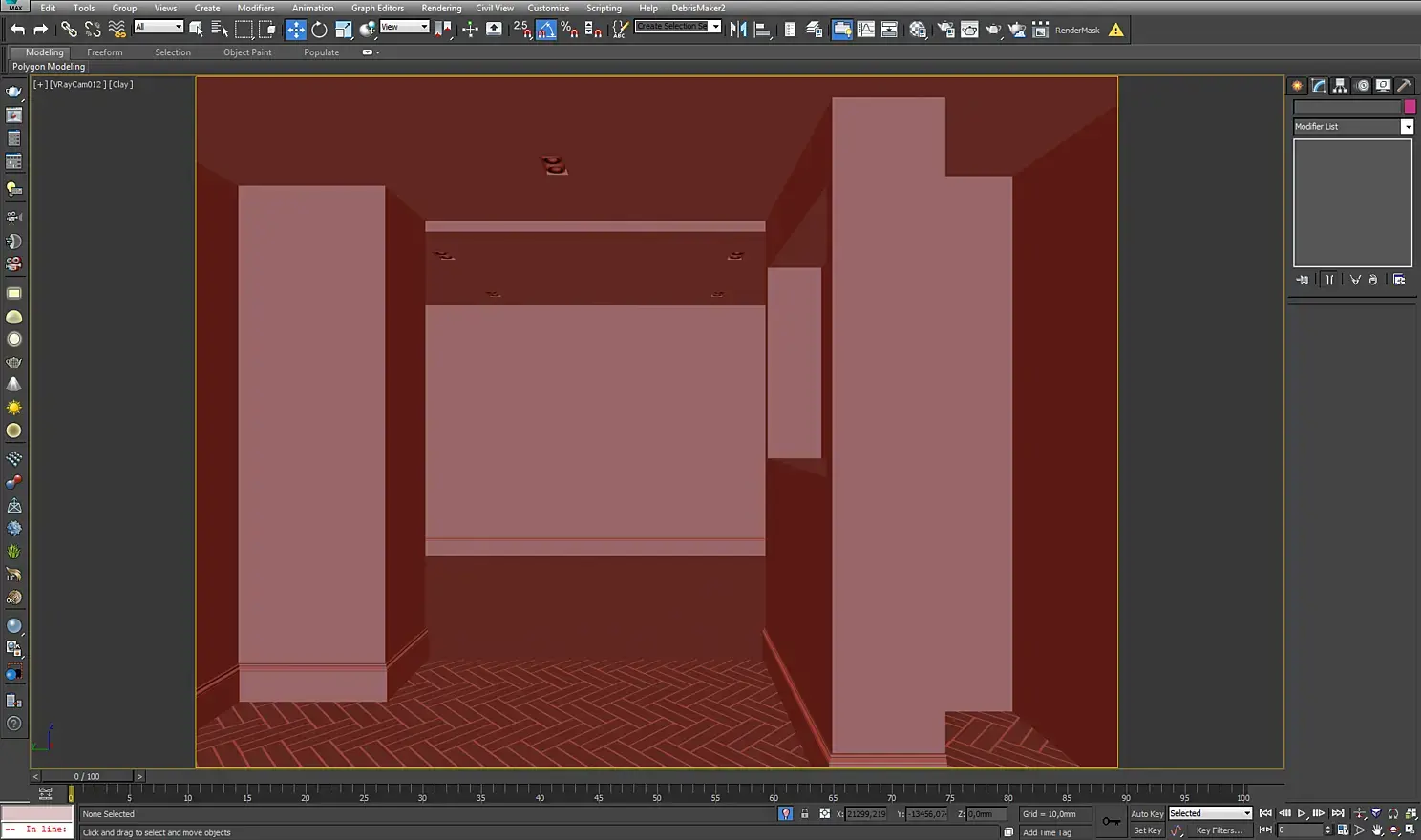 Так как я изначально планировал много ракурсов, хотел показать обеденные помещения, то я построил коробку всей квартиры и уже потом делил ее на помещения таким образом, чтобы можно было делать кадры из коридора с открытыми дверьми.